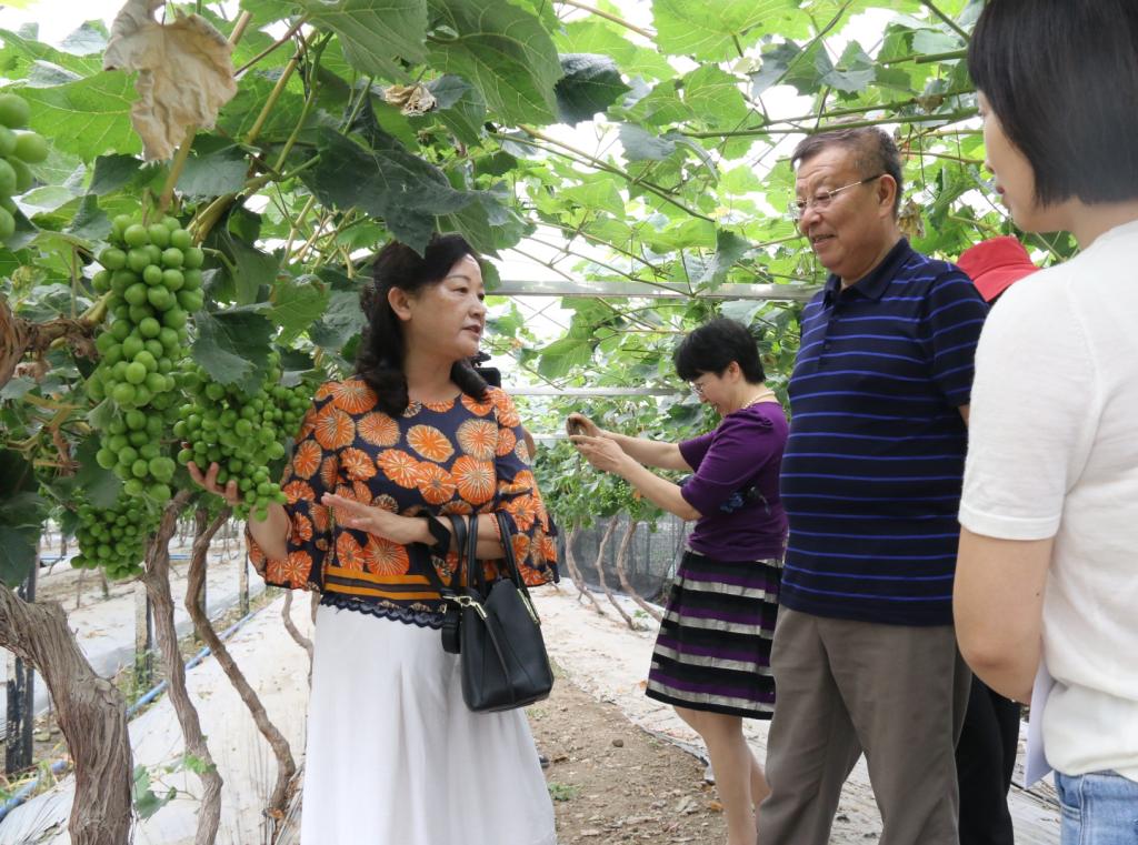 在葡萄新品种及其关键技术示范园,全国脱贫攻坚先进个人、我校园艺学院吕秀兰教授重点介绍了高畦宽行“天膜+地膜”双膜覆盖和防鸟网围棚葡萄种植模式,以及低密度“H”型水平棚架高位结果的“一长长、二中中、三短中”摘心和四长枝曲枝省力修剪技术,精准肥水一体化及枝蔓花果数字化管理技术和有害生物绿色防控技术。通过这些技术,园区实现了产品优质安全和节本增效。通过推广这些技术,有效带动了农户脱贫致富。