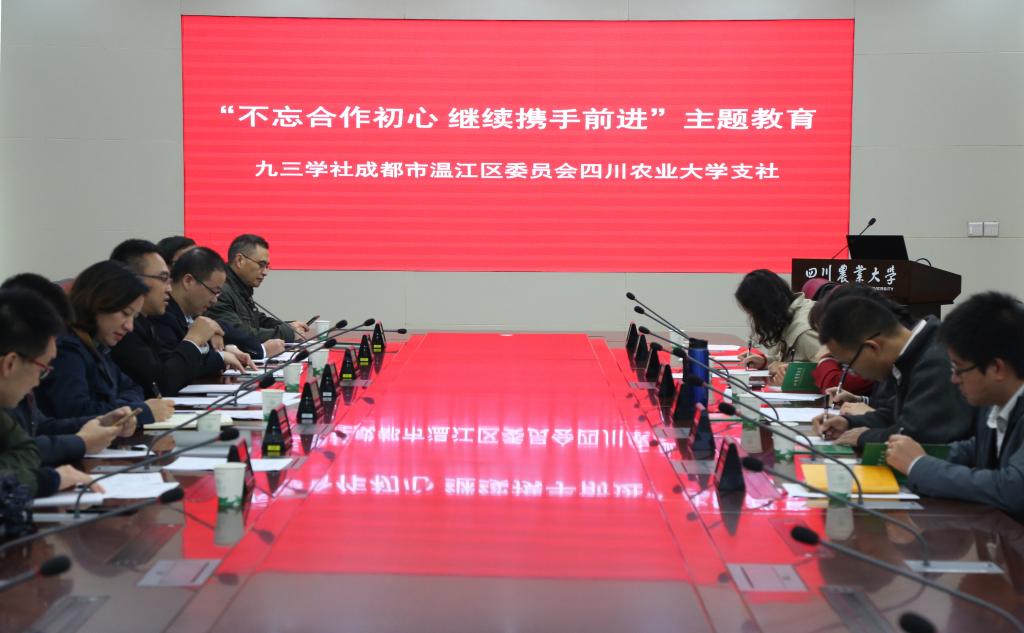 10月24日下午,九三学社成都市温江区委员会太阳集团tyc86支社开展“不忘合作初心 继续携手前进”主题教育活动。九三学社成都市温江区委员会主委景仁志、副主委朱学荣,学校宣传统战部副部长陈从楷及支社全体成员参会。会议由九三学社川农大支社主委黄志清主持。