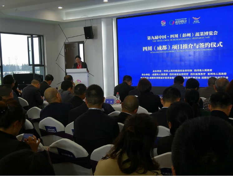 在永久会址6楼,召开了“四川(成都)项目推介与签约仪式”和“中国▪四川(彭州)蔬菜产销对接会”。签约会由彭州市委常委、副市长张雄正主持,成都市、彭州市多位领导参会并发表讲话,会后当场签约多项投资合作项目。李焕秀应邀在签约大会作讲话。她从人文历史优势、地里环境优势、栽培技术优势对彭州冬春蔬菜的产业优势进行了详细讲解,分析了进一步发展和壮大产业的机遇。