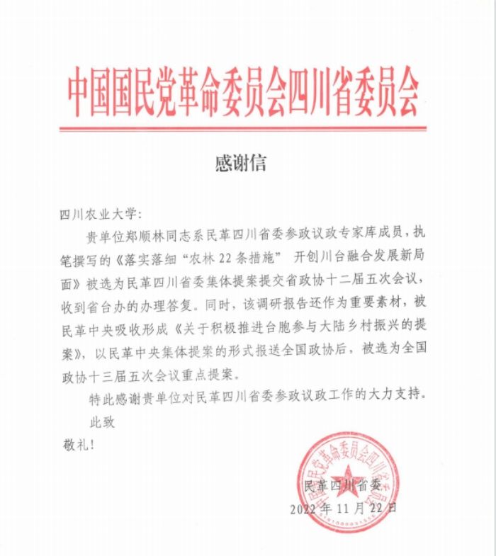 近日,民革四川省委向我校发来感谢信,对民革川农大总支副主委、农学院教授郑顺林积极咨政建言表示充分肯定,对学校大力支持民革四川省委参政议政工作表达诚挚感谢。