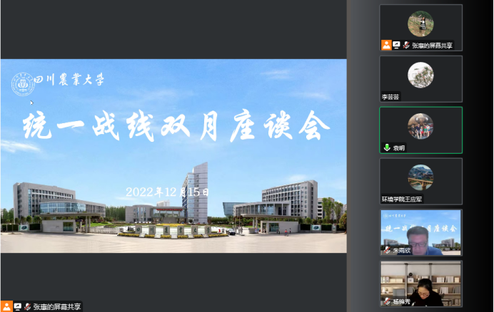 12月15日下午,我校2022年度统一战线第四次双月座谈会通过腾讯会议云端举行。校党委副书记、工会主席张强,党委常委、统战部部长、马克思主义学院院长杨锦秀,统战部副部长、宣传部副部长朱雨欣,学校各民主党派、知联会负责人及无党派人士代表等20余人参加会议。会议由朱雨欣主持。