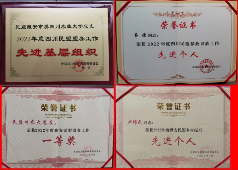 民盟川农大总支荣获“2022年度四川民盟盟务工作先进基层组织”,盟员吴德校长荣获“2022年度四川民盟参政议政工作先进个人”。随后,在民盟雅安市委2月1日召开的第五届委员会第五次全体(扩大)会议上,民盟川农大总支再次荣获“2022年度雅安民盟盟务工作一等奖”,盟员卢修元荣获“2022年度雅安民盟乡村振兴先进个人”。这一系列成绩的取得,都凝聚了全校民盟盟员的辛勤汗水和努力付出,也充分体现了省市各级部门对学校盟务工作的高度认可。