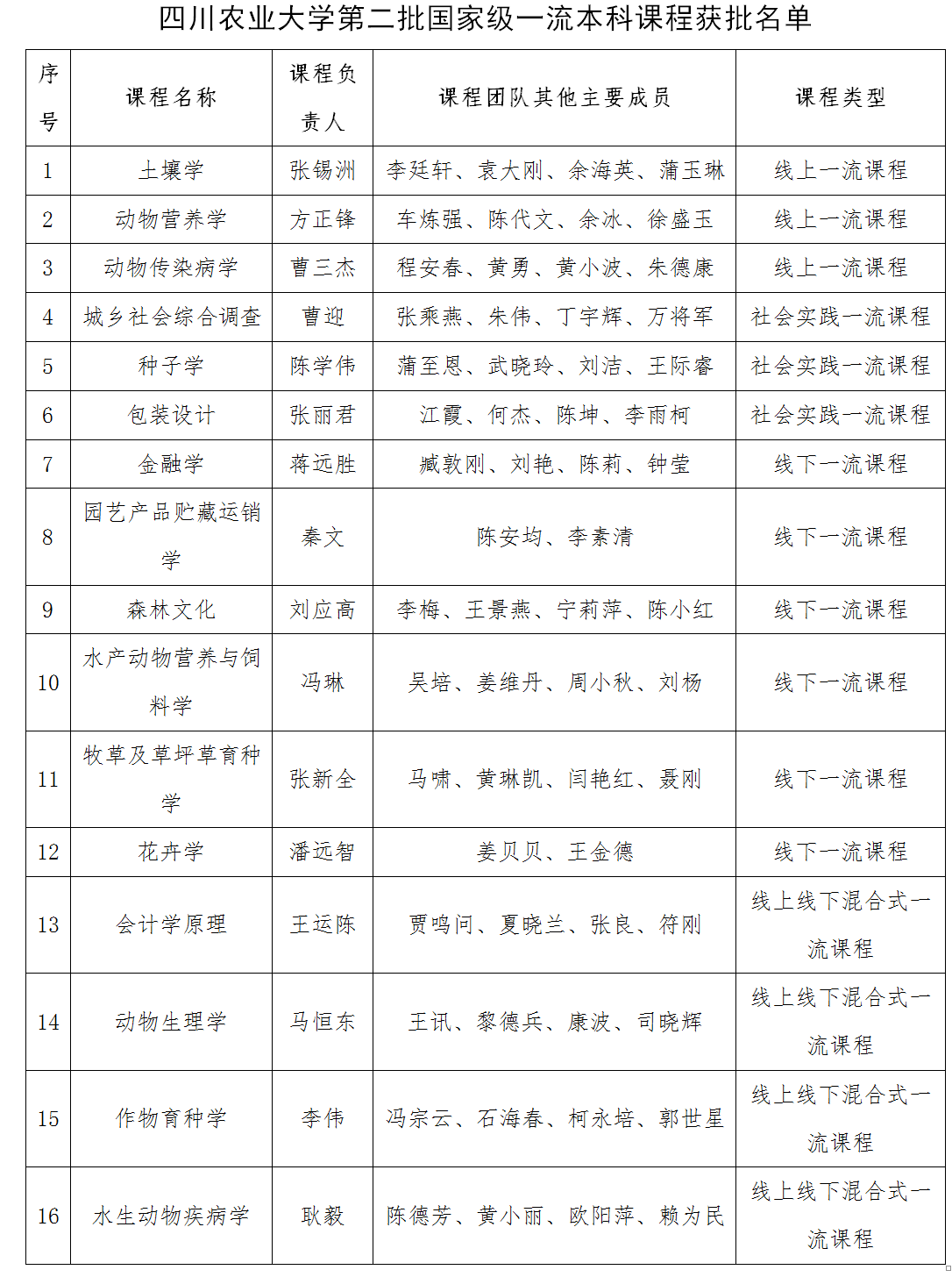 近日,教育部公布了第二批国家级一流本科课程认定结果,我校16门课程榜上有名,本次课程认定数量位居全国农林高校前列、全国高校前100名,其中由民建总支副主委、环境学院张锡洲教授负责的课程《土壤学》,及民盟中央青年委员、国重实验室主任陈学伟负责的课程《种子学》,分别获批线上一流课程及社会实践一流课程。至此,我校共有国家级一流本科课程17门,实现了五大“金课”全覆盖,标志着我校专业建设和人才培养迈上新台阶。