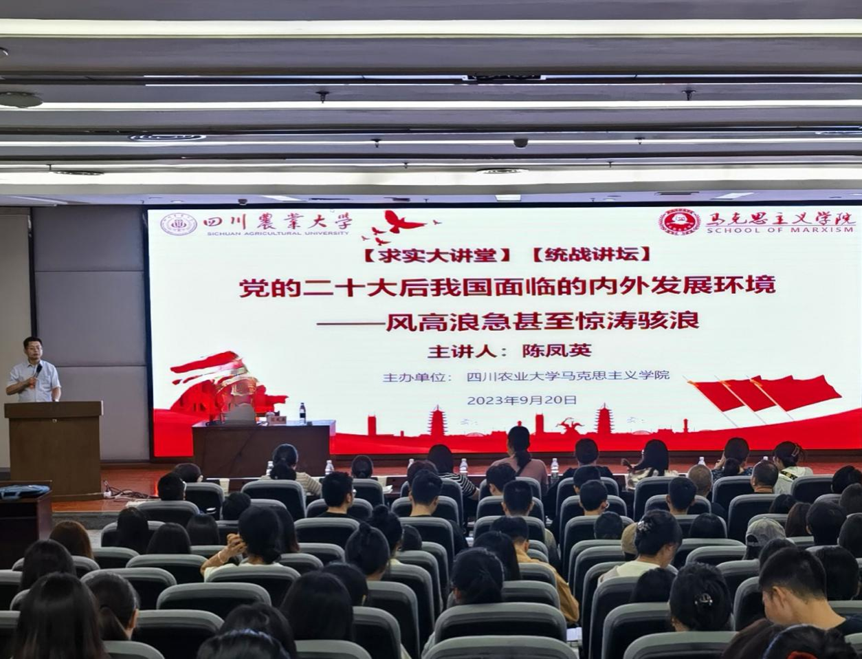 9月20日,由学校马克思主义学院主办、党委统战部协办的“求实大讲堂”暨“统战讲坛”在成都校区图书馆报告厅顺利举行。中国现代国际关系研究院世界经济研究所原所长,享受国务院政府特殊津贴,被聘为金砖国家经济智库中方成员的陈凤英研究员作客本期报告会,并作了题为“党的二十大后我国面临的内外发展环境一一风高浪急甚至惊涛骇浪”的专题报告。报告会由马克思主义学院党委书记杨世义主持,学校部分民主党派教师、无党派知识分子教师以及马克思主义学院教师、研究生等共同参与。