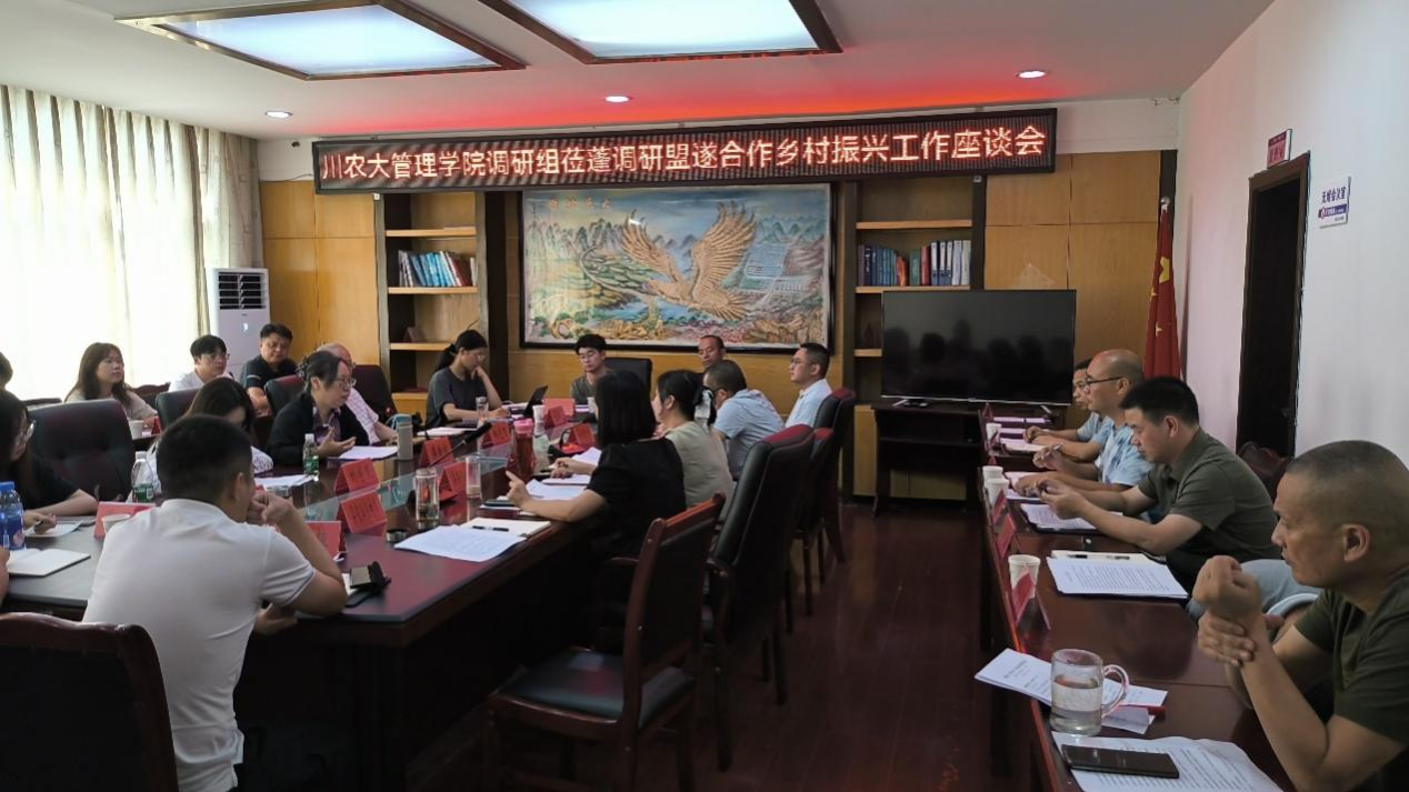 7月25-26日,民盟盟员、管理学院傅新红教授率队赴遂宁开展遂宁百益乡村振兴研究院“盟遂合作乡村振兴示范区建设”项目和“揭榜挂帅”项目“农村集体经济发展的遂宁模式”调研工作,刘宇荧、王丽双等管理学院师生9人同行。遂宁百益乡村振兴研究院常务副院长杨茂君、遂宁市委农办秘书科林建安陪同参加调研。