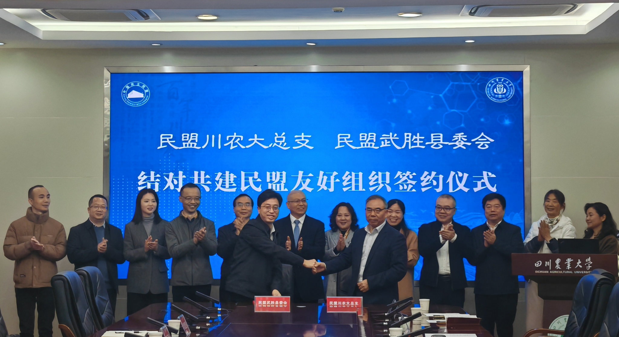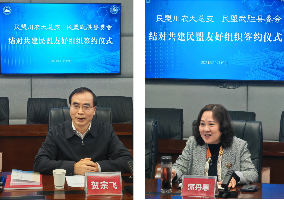 11月19日,我校民盟总支与民盟武胜县委会结对共建民盟友好组织签约仪式在成都校区一教301会议室举行,签约仪式由民盟雅安市委会副主委、动物营养所所长何军主持。民盟中央常委、民盟省委会副主委、校长吴德,民盟广安市委会主委、广安市人大常委会副主任贺宗飞,民盟雅安市委会主委、雅安市人大常委会副主任蒲丹惠,学校党委常委、统战部部长侯永翠,民盟广安市委会副主委、民盟武胜县委会主委、武胜县人民政府副县长周勇,民盟雅安市委会副主委、我校民盟总支主委、基地与实验室管理处副处长徐怀亮等参加仪式。
