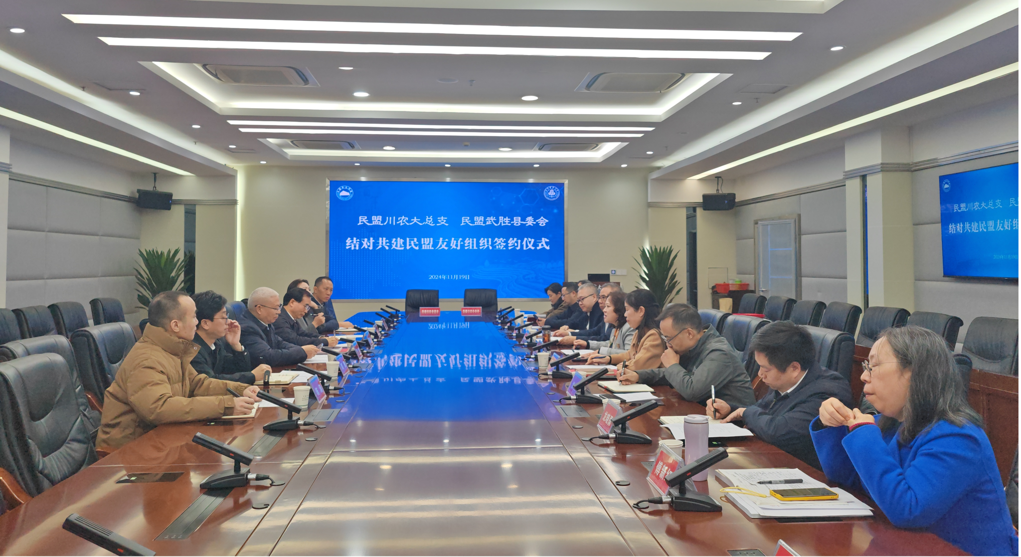 徐怀亮对民盟广安市委会一行的到来表示了热烈欢迎,并就民盟川农大总支的组织概况、盟务工作开展、盟员履职等方面进行了交流发言。周勇介绍了民盟武胜县委会基本情况、履职成果,诚挚希望民盟川农大总支专家到武胜县开展专家指导、专题调研、实地实践等合作活动。双方签订了《结对共建民盟友好组织合作协议书》,协议从强化盟务交流、信息成果互通、加强人员交流、深化校地合作等方面进行了约定。