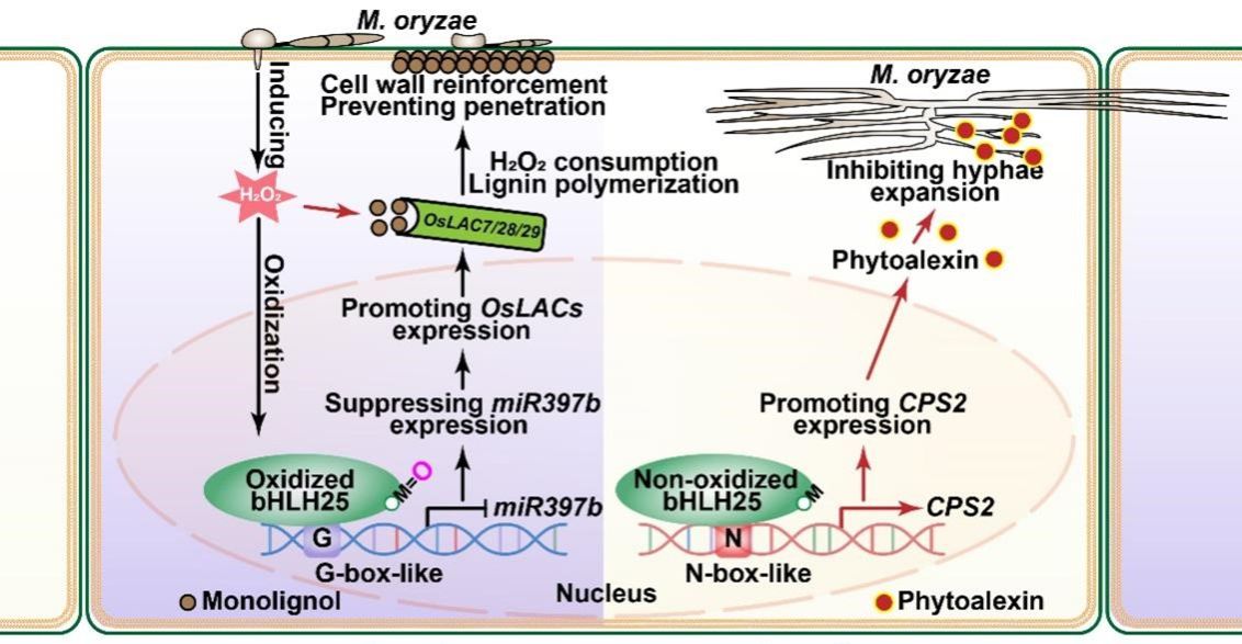 该研究发现bHLH25介导的抗病机制为:当植物遭到稻瘟菌等病原菌的侵袭时,植物自身会产生H2O2,H2O2会让bHLH25的第256位甲硫氨酸残基(M256)发生氧化修饰,氧化后的bHLH25会结合到miR397b前体基因的启动子上,并抑制miR397b的表达,积累漆酶基因的mRNA。这个过程使得植物木质素合成增强,细胞壁变得更坚固,能更好地抵御病原菌的入侵。而木质素合成的过程中会消耗掉一部分H2O2,使得bHLH25又转变回非氧化状态。非氧化状态的bHLH25又会结合到抗菌素合成酶基因CPS2的启动子上,促进CPS2的表达,从而增强抗菌素的合成,帮助植物抵抗那些已经进入体内的病原菌。bHLH25的这种作用机制很可能在植物中广泛存在,并赋予植物对多病害的广谱抗性。