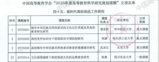 近日,中国高等教育学会正式公布了“2025年度高等教育科学研究规划课题”立项名单。党委统战部办公室主任张惠负责的《文化强国战略下高校统战文化的品牌建设研究》成功获批,入选“新时代高校统战工作研究”专项课题。据悉,本年度该专项课题全国仅立项24项,四川省范围内仅有我校与成都理工大学、成都信息工程大学三所高校获此殊荣。