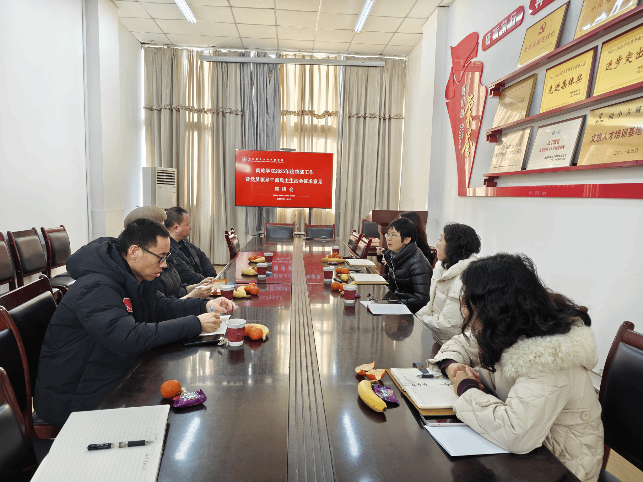 1月8日上午,商旅学院在3202会议室召开2025年度统战工作暨党员领导干部民主生活会征求意见座谈会。学院领导班子、党外知识分子、无党派人士等代表欢聚一堂,共贺新年,共叙友情、共话发展。学院党委书记郭凌主持会议。