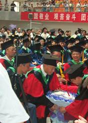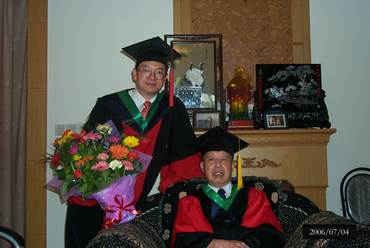 7月4号,终于迎来隆重的授位典礼。当我从校长手里接过学位证书走下主席台,我的研究生给我献花,我马上献给了前排就座的先生(下图左),这是学生发自内心的敬意和感谢!随后,又到先生家里拍下来一张学位服合影(下图右),装裱后恭送给先生留念。先生一直将它挂在客厅里,或许是圆满收山的欣慰吧。
