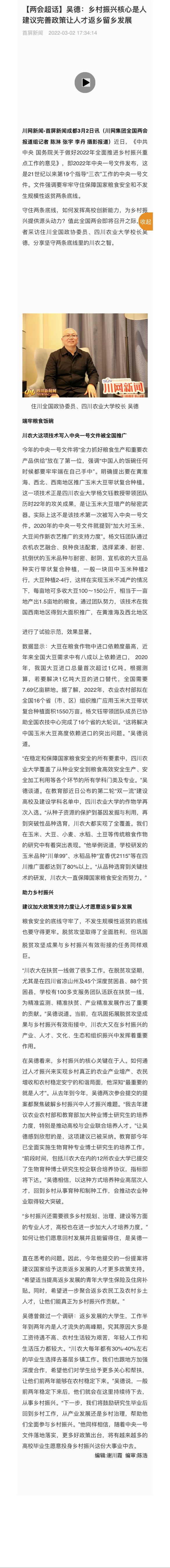 (首屏新闻)【两会超话】吴德:乡村振兴核心是人 建议完善政策让人才返乡留乡发展
