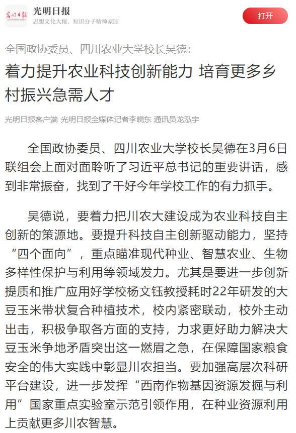 吴德说,要着力把川农大建设成为农业科技自主创新的策源地。要提升科技自主创新驱动能力,坚持“四个面向”,重点瞄准现代种业、智慧农业、生物多样性保护与利用等领域发力。尤其是要进一步创新提质和推广应用好学校杨文钰教授耗时22年研发的大豆玉米带状复合种植技术,校内紧密联动,校外主动出击,积极争取各方面的支持,力求更好助力解决大豆玉米争地矛盾突出这一燃眉之急,在保障国家粮食安全的伟大实践中彰显川农担当。要加强高层次科研平台建设,进一步发挥“西南作物基因资源发掘与利用”国家重点实验室示范引领作用,在种业资源利用上贡献更多川农智慧。