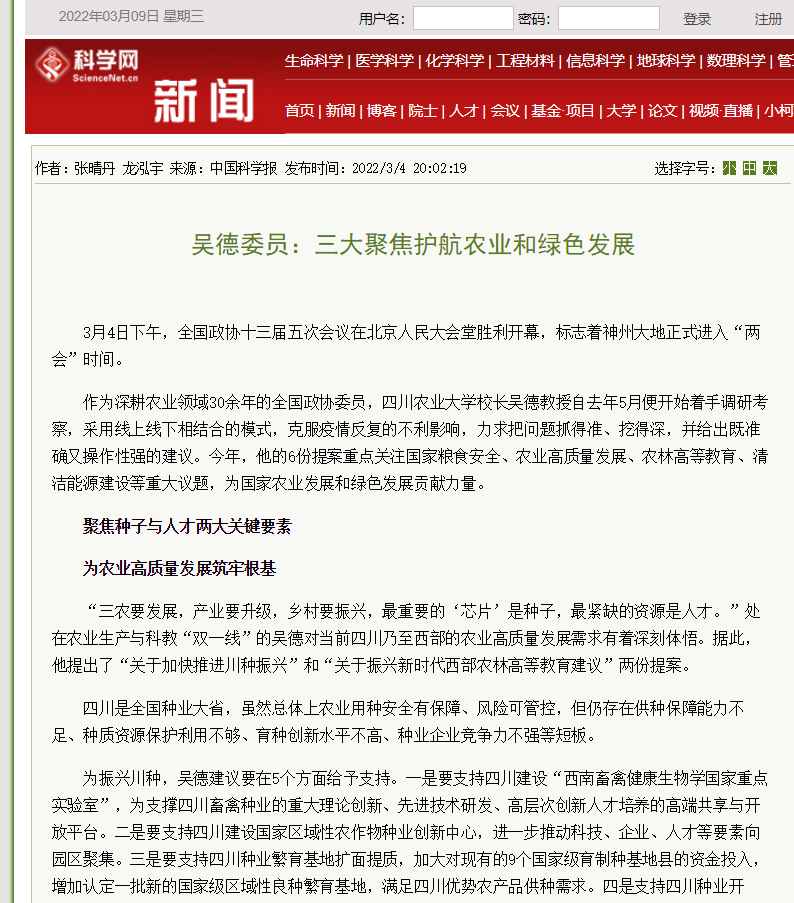 为振兴川种,吴德建议要在5个方面给予支持。一是要支持四川建设“西南畜禽健康生物学国家重点实验室”,为支撑四川畜禽种业的重大理论创新、先进技术研发、高层次创新人才培养的高端共享与开放平台。二是要支持四川建设国家区域性农作物种业创新中心,进一步推动科技、企业、人才等要素向园区聚集。三是要支持四川种业繁育基地扩面提质,加大对现有的9个国家级育制种基地县的资金投入,增加认定一批新的国家级区域性良种繁育基地,满足四川优势农产品供种需求。四是支持四川种业开展“卡脖子”技术攻关,集中资源和力量对主要农作物和畜禽种源,开展生物技术和信息技术在育种中的应用研究。五是要支持四川优势种业企业做大做强。