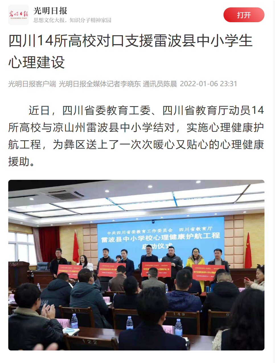 近日,四川省委教育工委、四川省教育厅动员14所高校与凉山州雷波县中小学结对,实施心理健康护航工程,为彝区送上了一次次暖心又贴心的心理健康援助。