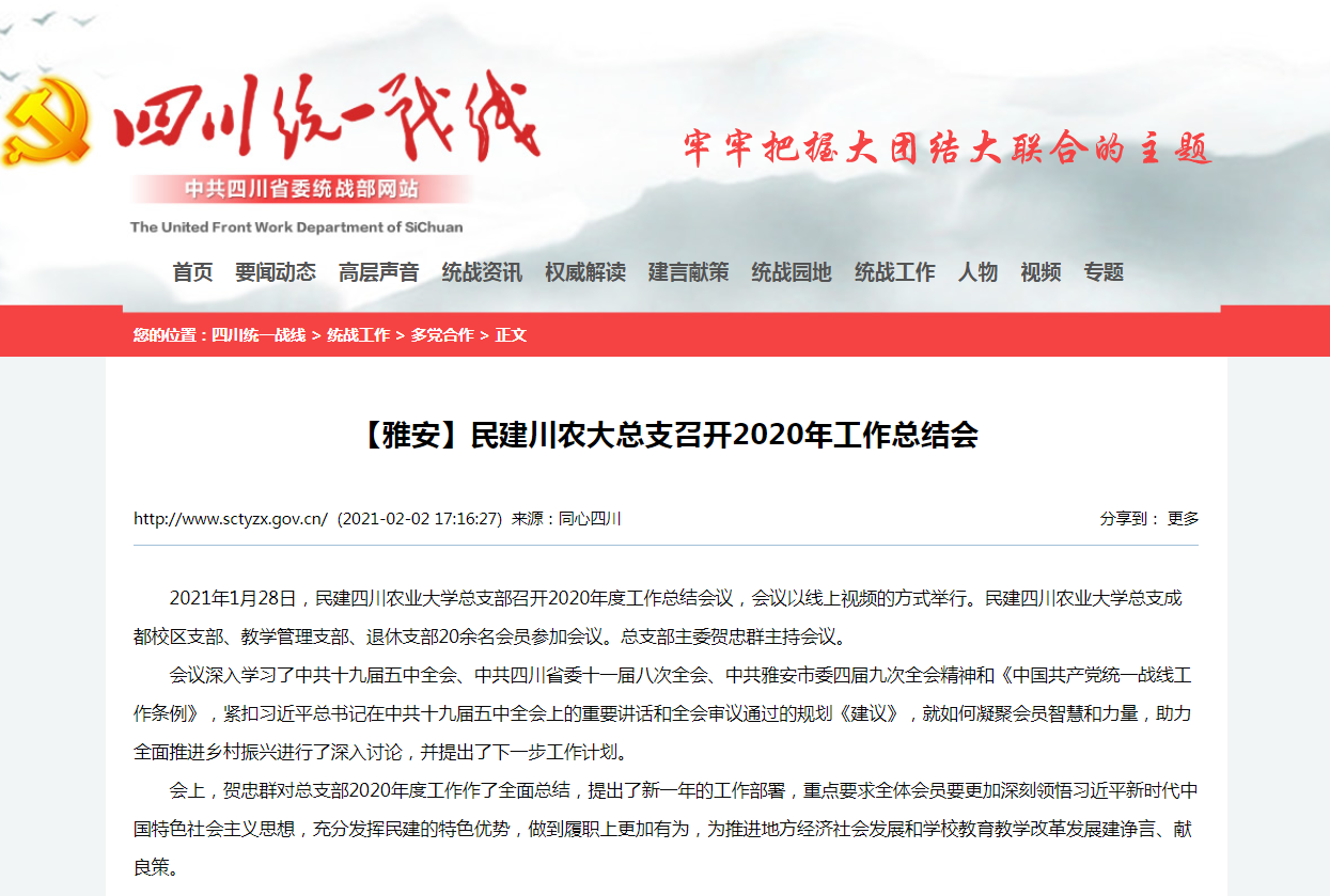 2021年1月28日,民建太阳集团tyc86总支部召开2020年度工作总结会议,会议以线上视频的方式举行。民建太阳集团tyc86总支成都校区支部、教学管理支部、退休支部20余名会员参加会议。总支部主委贺忠群主持会议。
