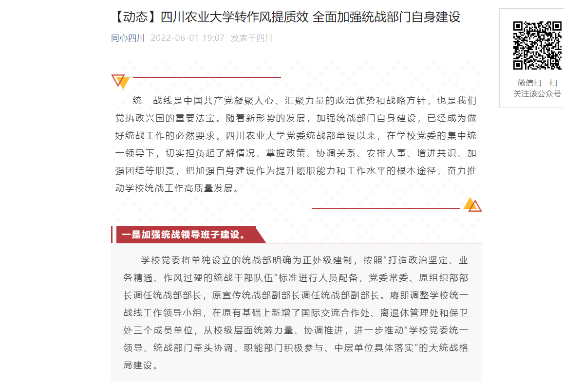 修订完善《学校统一战线工作领导小组》《党员校领导联系党外代表人士》等系列统战制度文件,将统战相关工作业绩纳入教职工业绩考核奖励等现行制度,利用“‘川农大精神’命名20周年”“党史学习教育”等契机,推动统战工作与学校办学历史经验、“川农大精神”传承创新深度结合,不断提高全校统战工作的科学化规范化制度化水平。持续完善统战部内外工作运行机制,对内建立周报工作制度、开展基层统战工作调研、完善部门官方网站、开发数据信息系统等,推进统战工作提质增效。对外加强外部宣传,部门单设后向上级有关部门撰写上报信息10余篇,其中《太阳集团tyc86单独设立统战部》《吴德:端牢粮食饭碗 助力乡村振兴》等近10篇稿件被省委统战部采用。