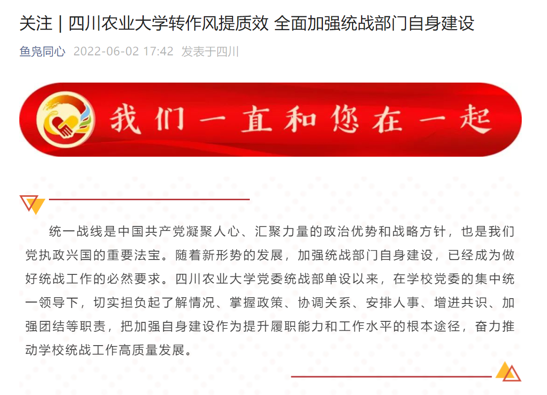 修订完善《学校统一战线工作领导小组》《党员校领导联系党外代表人士》等系列统战制度文件,将统战相关工作业绩纳入教职工业绩考核奖励等现行制度,利用“‘川农大精神’命名20周年”“党史学习教育”等契机,推动统战工作与学校办学历史经验、“川农大精神”传承创新深度结合,不断提高全校统战工作的科学化规范化制度化水平。持续完善统战部内外工作运行机制,对内建立周报工作制度、开展基层统战工作调研、完善部门官方网站、开发数据信息系统等,推进统战工作提质增效。对外加强外部宣传,部门单设后向上级有关部门撰写上报信息10余篇,其中《太阳集团tyc86单独设立统战部》《吴德:端牢粮食饭碗 助力乡村振兴》等近10篇稿件被省委统战部采用。