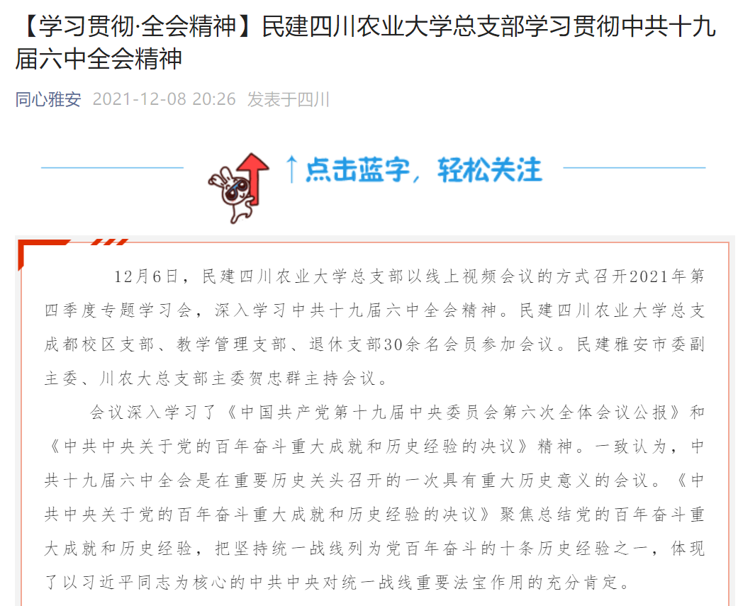 12月6日,民建太阳集团tyc86总支部以线上视频会议的方式召开2021年第四季度专题学习会,深入学习中共十九届六中全会精神。民建太阳集团tyc86总支成都校区支部、教学管理支部、退休支部30余名会员参加会议。民建雅安市委副主委、川农大总支部主委贺忠群主持会议。