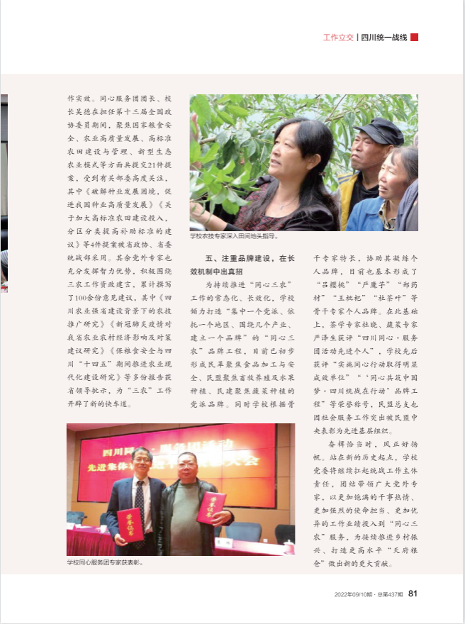 为持续推进“同心三农”工作的常态化、长效化,学校倾力打造“集中一个党派、依托一个地区、围绕几个产业、建立一个品牌”的“同心三农”品牌工程,目前已初步形成民革聚焦食品加工与安全、民盟聚焦畜牧养殖及水果种植、民建聚焦蔬菜种植的党派品牌。同时学校根据骨干专家特长,协助其凝练个人品牌,目前也基本形成了“吕樱桃”“严魔芋”“郑药材”“王枇杷”“杜茶叶”等骨干专家个人品牌。在此基础上,茶学专家杜晓、蔬菜专家严泽生获评“四川同心·服务团活动先进个人”,学校先后获评“实施同心行动取得明显成效单位”“同心共筑中国梦,四川统战在行动品牌工程”等荣誉称号,民盟总支也因社会服务工作突出被民盟中央表彰为先进基层组织。