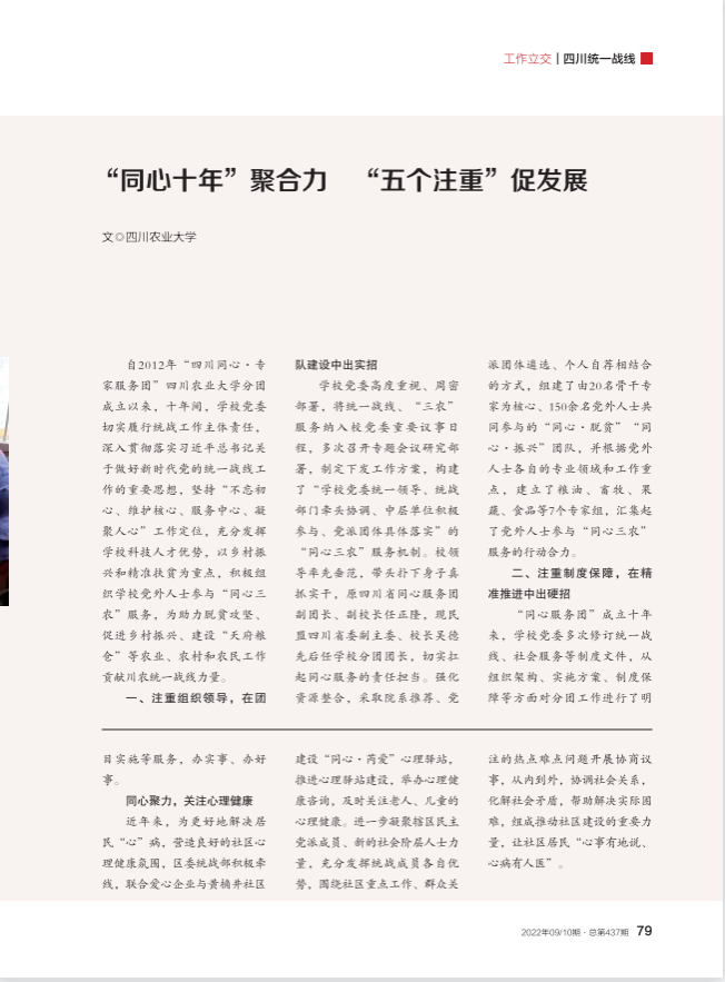 学校党委创新工作思路,通过建言献策提升同心服务工作实效。同心服务团团长、校长吴德在担任第十三届全国政协委员期间,聚焦国家粮食安全、农业高质量发展、高标准农田建设与管理、新型生态农业模式等方面共提交21件提案,受到有关部委高度关注,其中《破解种业发展困境,促进我国种业高质量发展》《关于加大高标准农田建设投入,分区分类提高补助标准的建议》等4件提案被省政协、省委统战部采用。其余党外专家也充分发挥智力优势,积极围绕三农工作咨政建言,累计撰写了100余份意见建议,其中《四川农业强省建设背景下的农技推广研究》《新冠肺炎疫情对我省农业农村经济影响及对策建议研究》《保粮食安全与四川“十四五”期间推进农业现代化建设研究》等多份报告获省领导批示,为“三农”工作开辟了新的快车道。