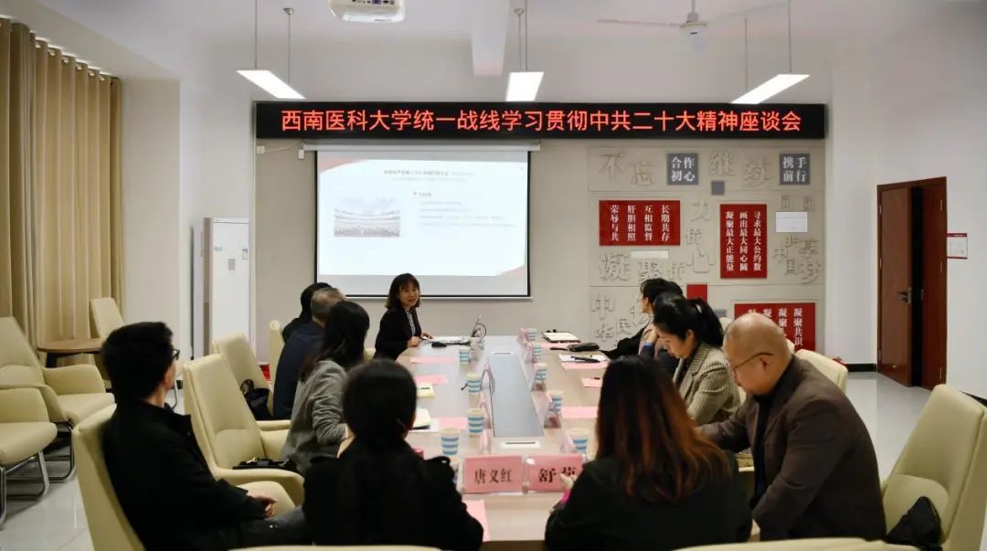 西南医科大学组织召开统一战线学习贯彻党的二十大精神座谈会,向各民主党派、统战团体及无党派人士代表传达党的二十大精神。会上,省委宣讲团成员、马克思主义学院副院长赵微教授紧扣党的二十大报告原文,以《团结奋斗同呼吸同心共圆中共梦》为题,紧扣习近平总书记“五个牢牢把握”的重要要求作了全面系统的宣讲报告。