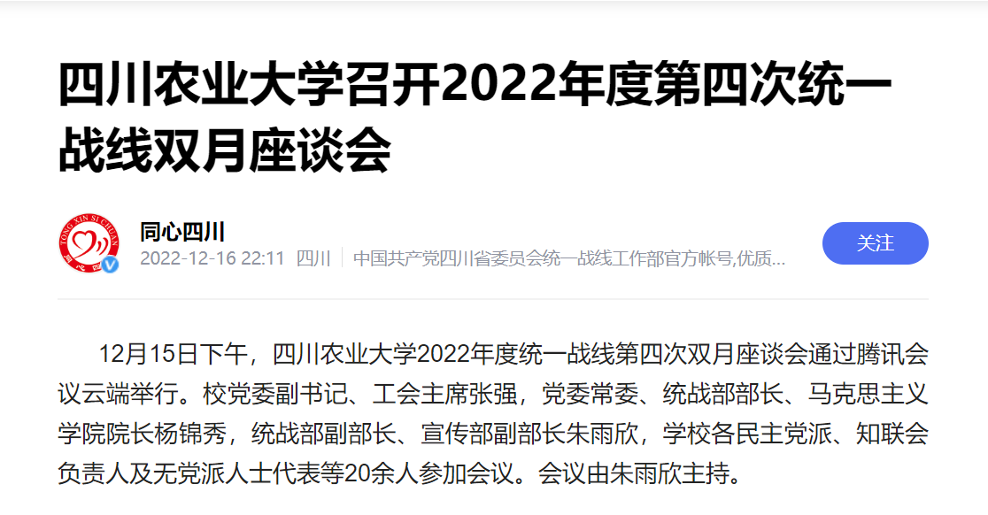 12月15日下午,太阳集团tyc862022年度统一战线第四次双月座谈会通过腾讯会议云端举行。校党委副书记、工会主席张强,党委常委、统战部部长、马克思主义学院院长杨锦秀,统战部副部长、宣传部副部长朱雨欣,学校各民主党派、知联会负责人及无党派人士代表等20余人参加会议。会议由朱雨欣主持。