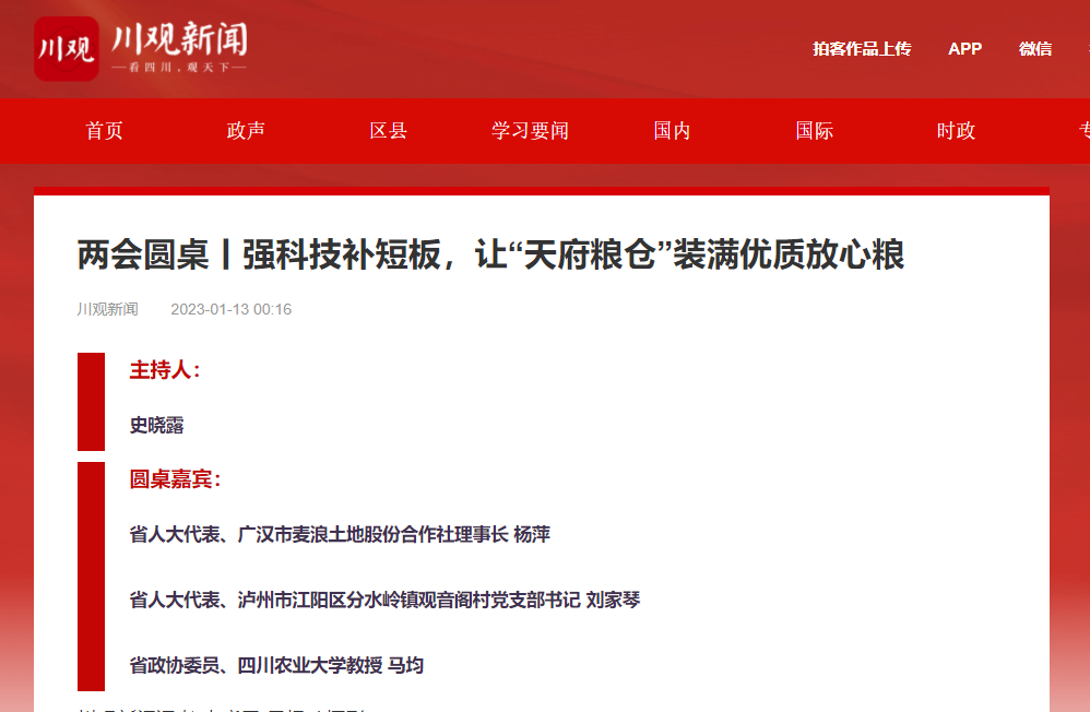 马均:作为农业科技工作者,我们要培育更多突破性的,高产优质高效高抗的粮食作物新品种;还要从技术层面,研发更多适合现代农业生产的突破性的核心新技术,包括机械化生产技术,绿色优质安全生产技术等,让我们的“天府粮仓”不仅装满粮,更要装满优质粮、放心粮。