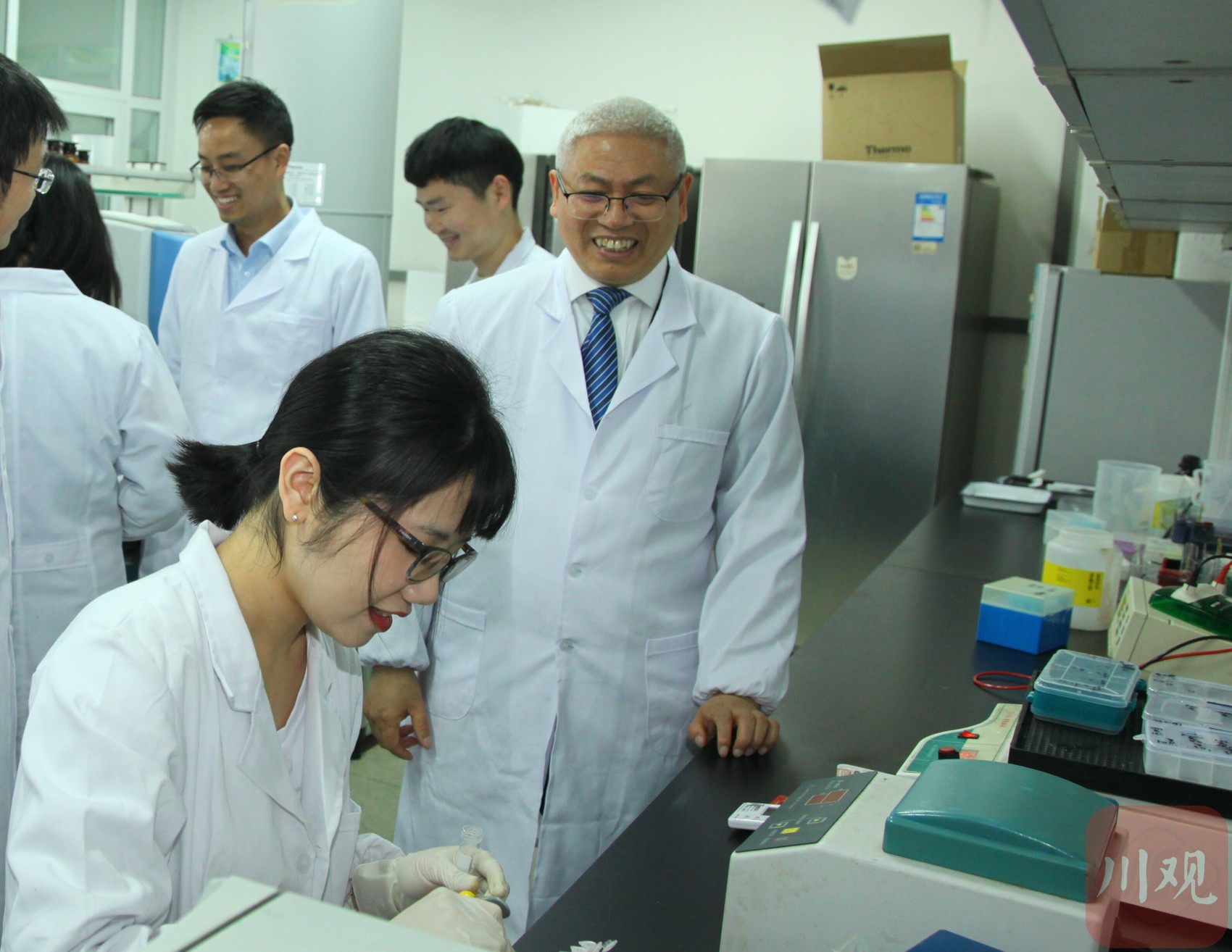 吴德(右1)在实验室指导学生做实验。