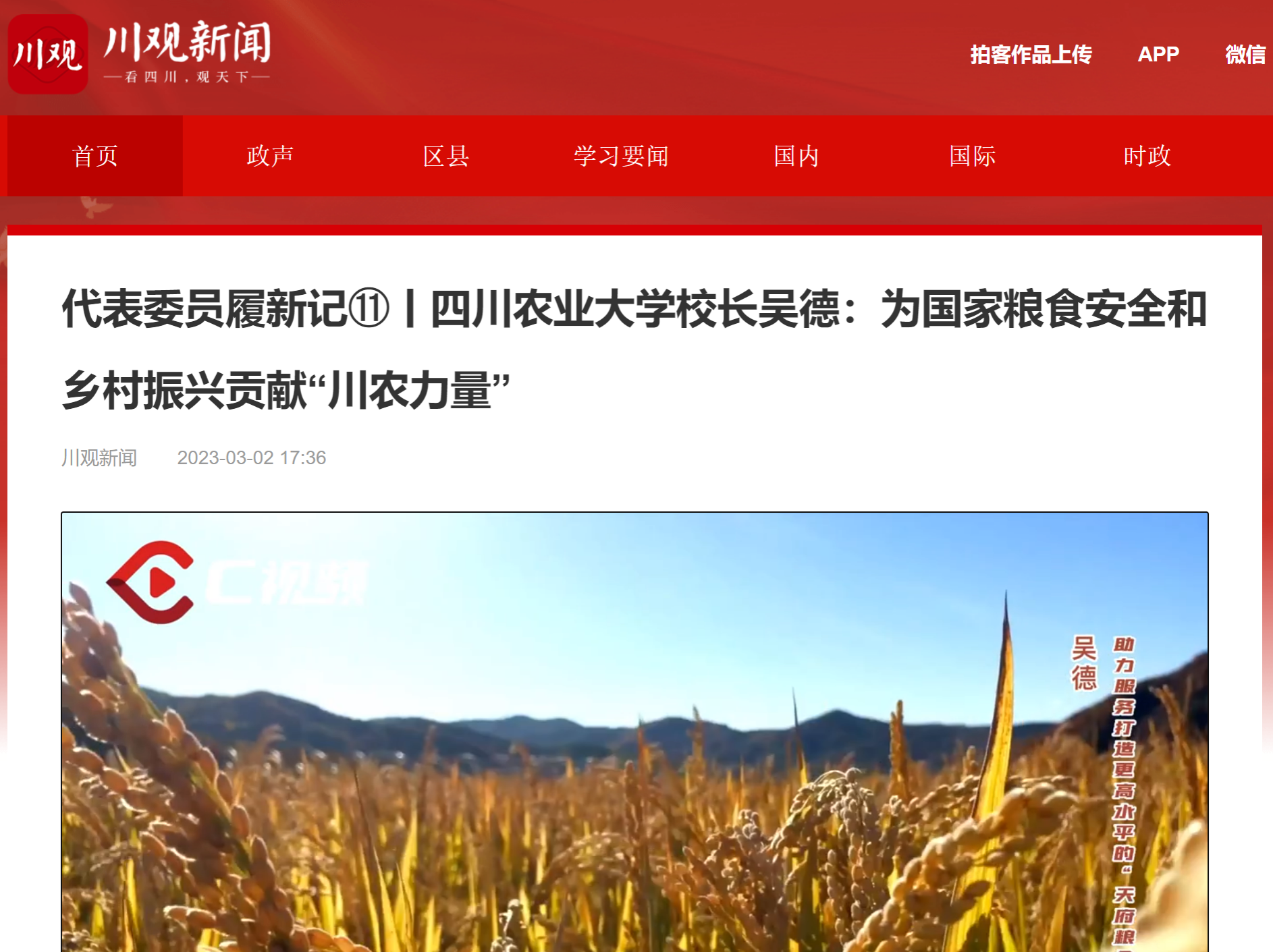 近段时间,吴德格外忙碌,一边忙着深入乡村振兴一线调研,一边忙着新学期的开学工作。“作为来自农业高校的全国人大代表,身处农业科研和管理一线,我深深感到责任重大,我要努力为国家粮食安全和乡村振兴拿出‘川农方案’,让中国碗装中国粮、装优质中国好粮。”