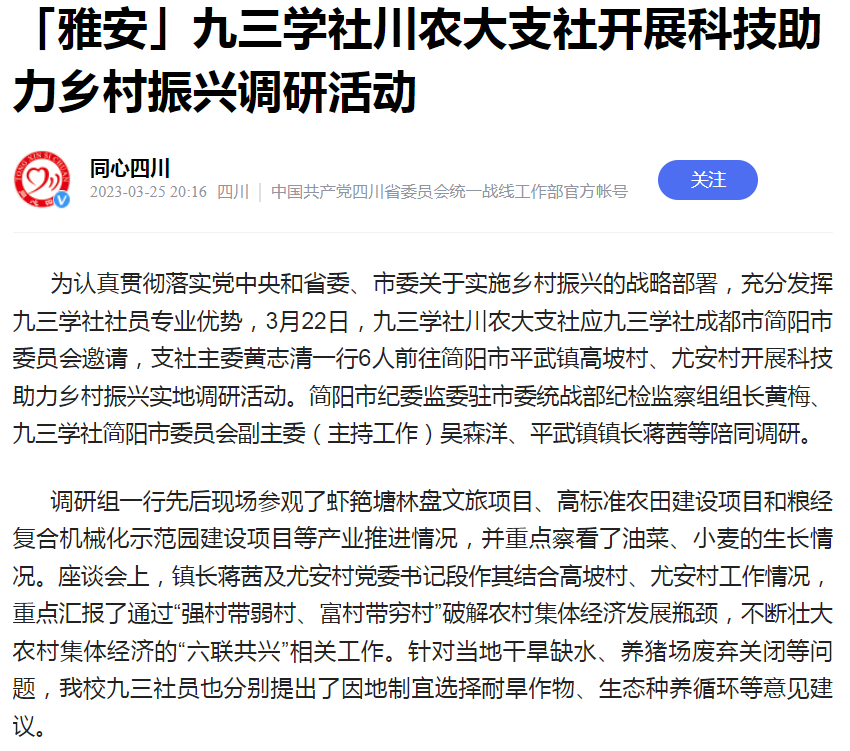 为认真贯彻落实党中央和省委、市委关于实施乡村振兴的战略部署,充分发挥九三学社社员专业优势,3月22日,九三学社川农大支社应九三学社成都市简阳市委员会邀请,支社主委黄志清一行6人前往简阳市平武镇高坡村、尤安村开展科技助力乡村振兴实地调研活动。简阳市纪委监委驻市委统战部纪检监察组组长黄梅、九三学社简阳市委员会副主委(主持工作)吴森洋、平武镇镇长蒋茜等陪同调研。