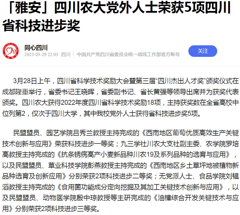 民盟盟员、园艺学院吕秀兰教授主持完成的《西南地区葡萄优质高效生产关键技术创新与应用》荣获科技进步一等奖;九三学社川农大支社副主委、农学院罗培高教授主持完成的《抗条锈病高产小麦新品种川农19及系列品种的选育与应用》,以及民盟盟员、草业科技学院彭燕教授主持完成的《西南地区乡土草坪地被植物新品种选育及创新应用》分别荣获2项科技进步二等奖;无党派人士、食品学院刘韫滔教授主持完成的《食用菌功能成分定向挖掘及其加工关键技术创新与应用》,以及民盟盟员、动物医学院殷中琼教授等主研完成的《油樟综合开发关键技术与应用》分别荣获2项科技进步三等奖。