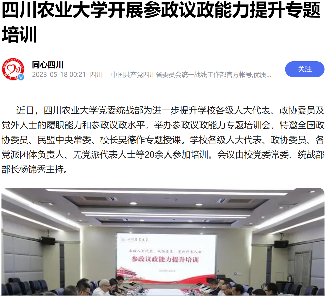 吴德强调,参政议政是人大代表和政协委员的重要职责,也是民主党派履职尽责的生命线,希望学校各级人大代表、政协委员及党派团体同志,切实提高政治站位、不断强化使命担当,紧紧围绕地方党委政府中心工作和地方经济建设发展实际,提出更多有针对性、建设性、实用性的意见和建议,更好地发出川农大声音、展现川农大作为。