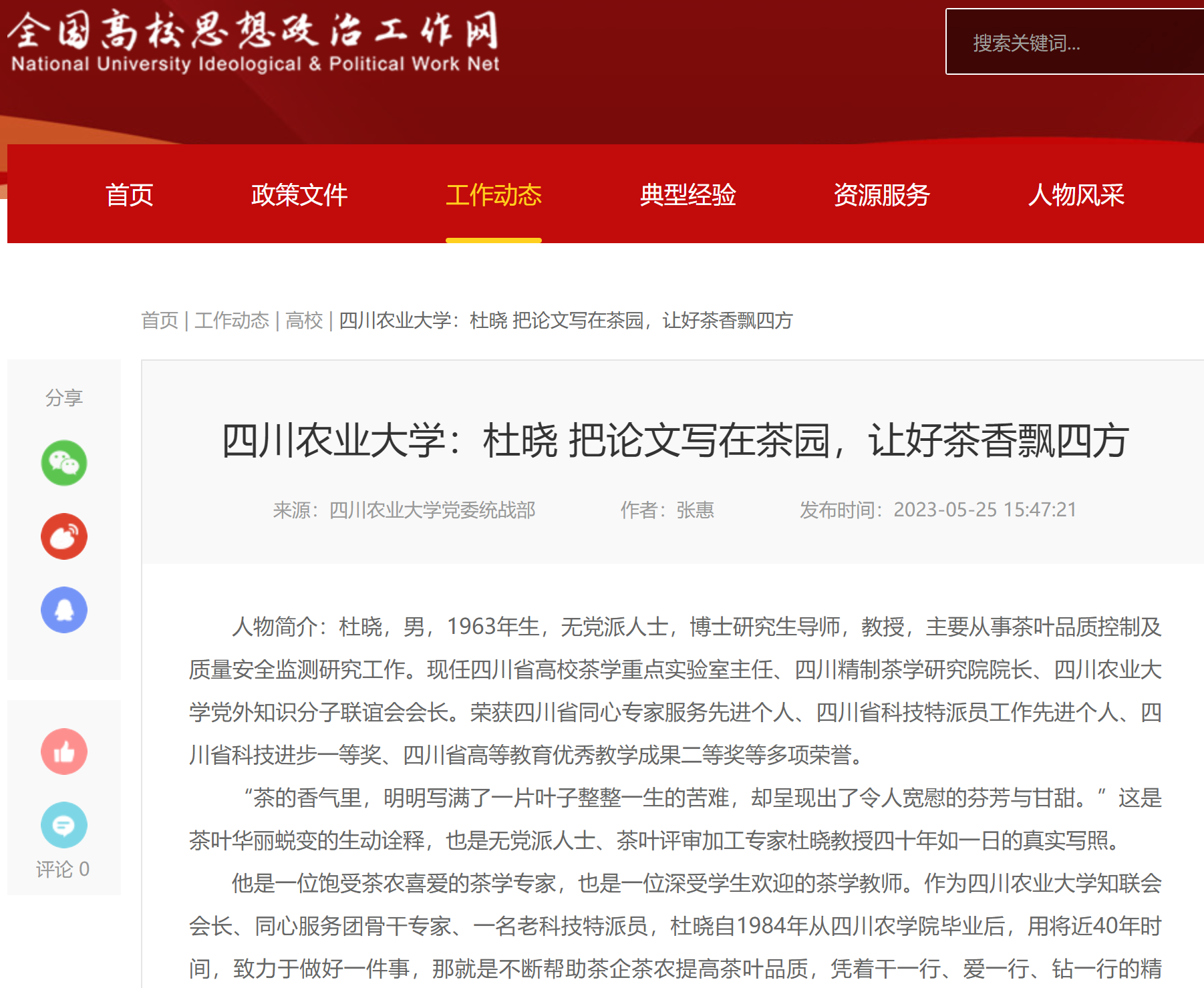 “茶的香气里,明明写满了一片叶子整整一生的苦难,却呈现出了令人宽慰的芬芳与甘甜。”这是茶叶华丽蜕变的生动诠释,也是无党派人士、茶叶评审加工专家杜晓教授四十年如一日的真实写照。