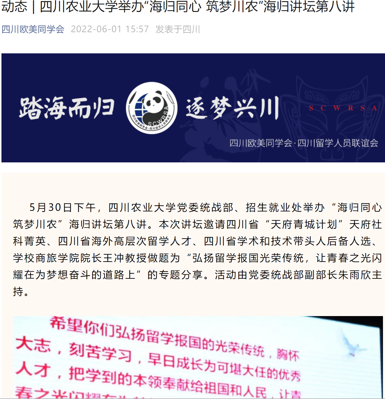 5月30日下午,太阳集团tyc86党委统战部、招生就业处举办“海归同心 筑梦川农”海归讲坛第八讲。本次讲坛邀请四川省“天府青城计划”天府社科菁英、四川省海外高层次留学人才、四川省学术和技术带头人后备人选、学校商旅学院院长王冲教授做题为“弘扬留学报国光荣传统,让青春之光闪耀在为梦想奋斗的道路上”的专题分享。活动由党委统战部副部长朱雨欣主持。