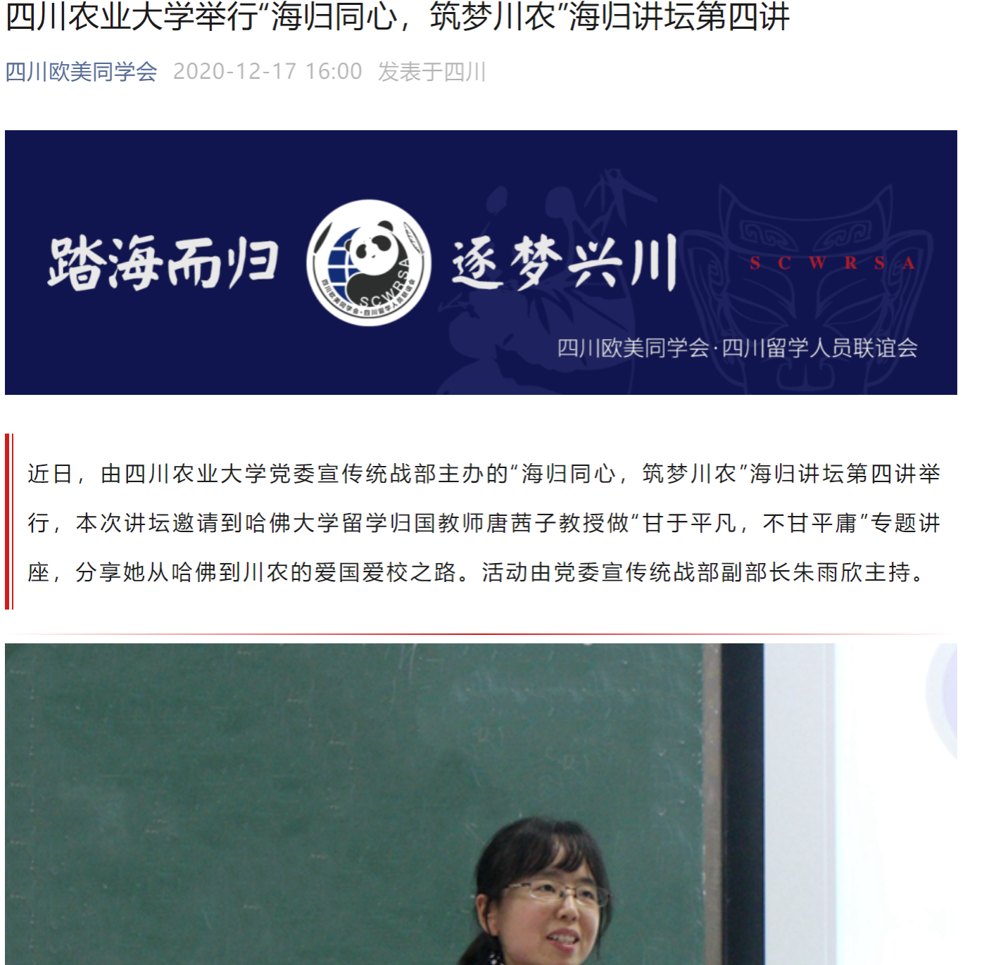 近日,由太阳集团tyc86党委宣传统战部主办的“海归同心,筑梦川农”海归讲坛第四讲举行,本次讲坛邀请到哈佛大学留学归国教师唐茜子教授做“甘于平凡,不甘平庸”专题讲座,分享她从哈佛到川农的爱国爱校之路。活动由党委宣传统战部副部长朱雨欣主持。