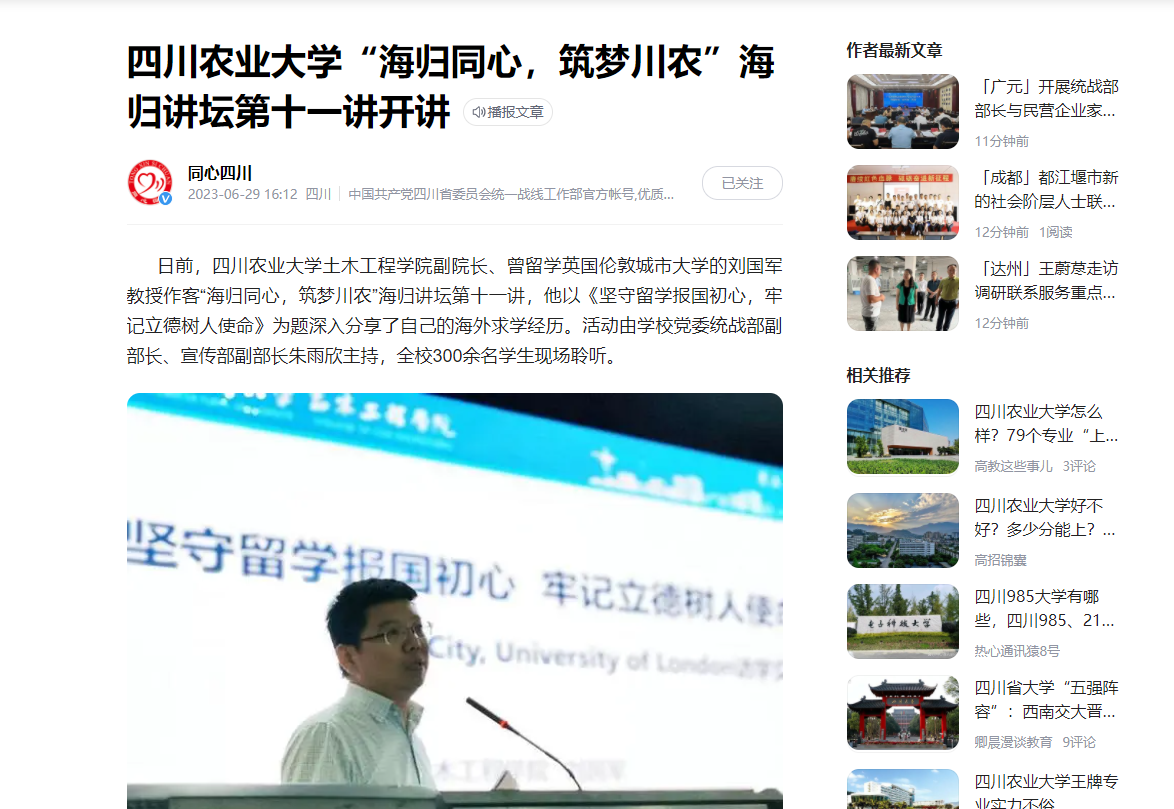 日前,太阳集团tyc86土木工程学院副院长、曾留学英国伦敦城市大学的刘国军教授作客“海归同心,筑梦川农”海归讲坛第十一讲,他以《坚守留学报国初心,牢记立德树人使命》为题深入分享了自己的海外求学经历。活动由学校党委统战部副部长、宣传部副部长朱雨欣主持,全校300余名学生现场聆听。
