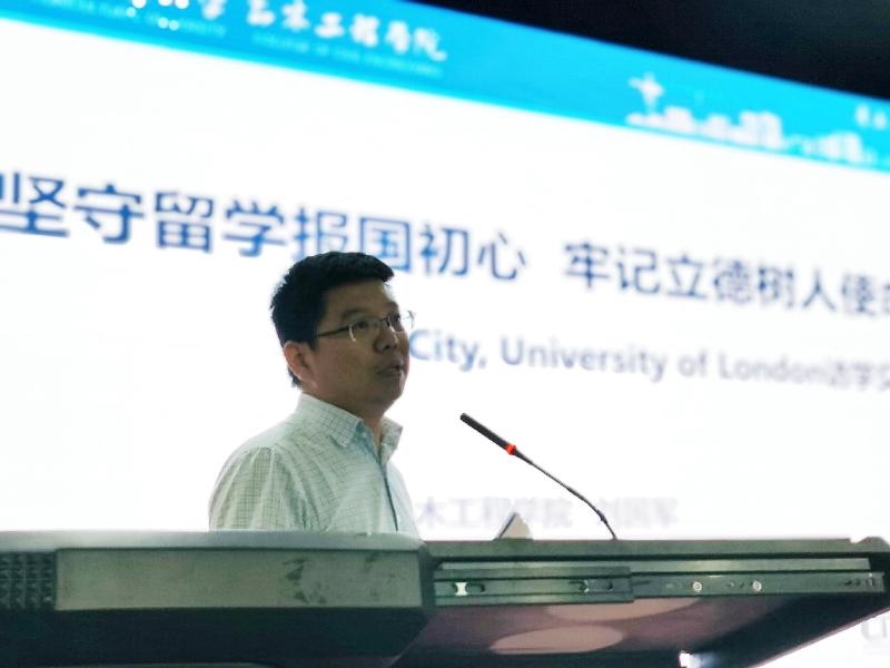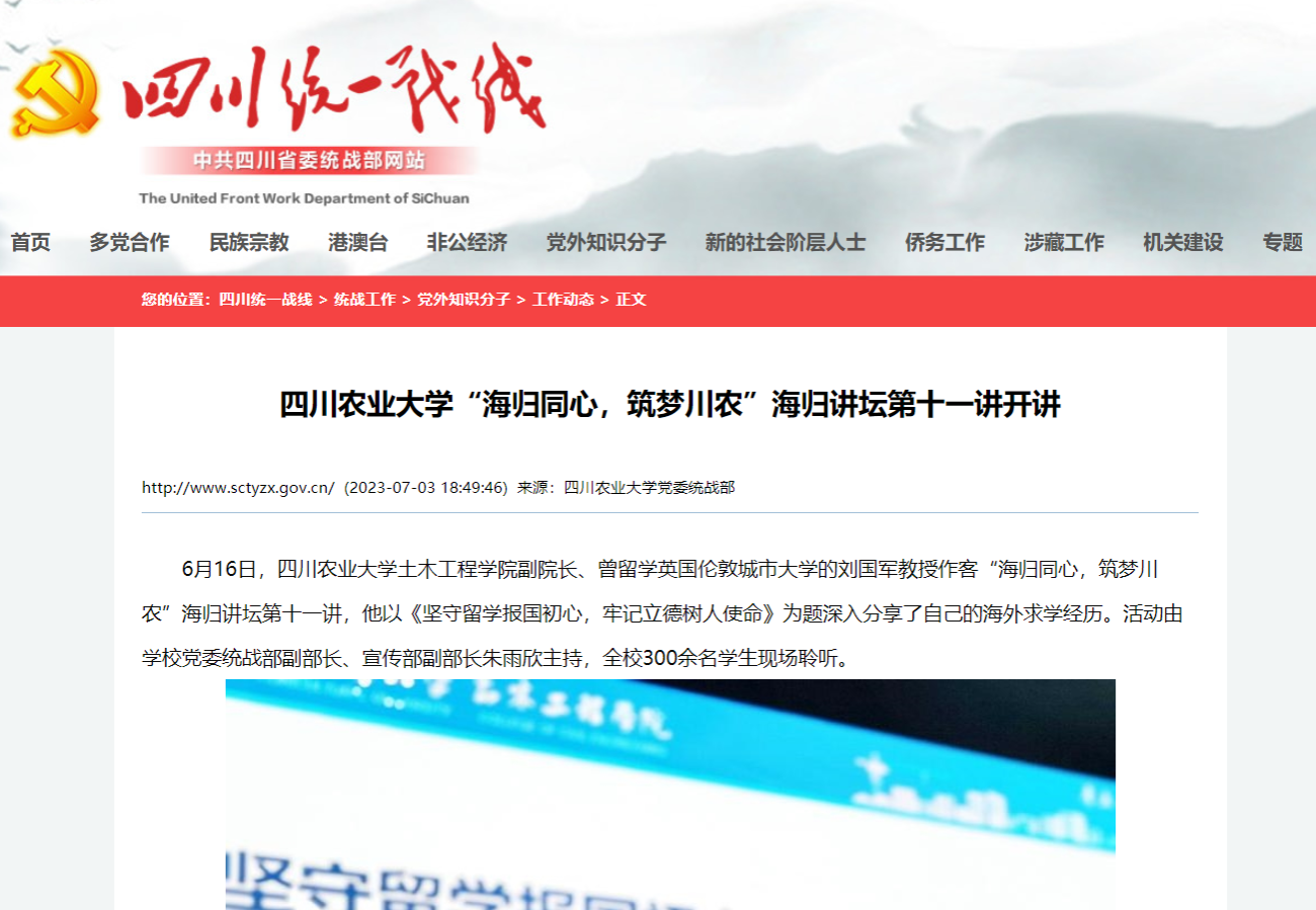 6月16日,太阳集团tyc86土木工程学院副院长、曾留学英国伦敦城市大学的刘国军教授作客“海归同心,筑梦川农”海归讲坛第十一讲,他以《坚守留学报国初心,牢记立德树人使命》为题深入分享了自己的海外求学经历。活动由学校党委统战部副部长、宣传部副部长朱雨欣主持,全校300余名学生现场聆听。