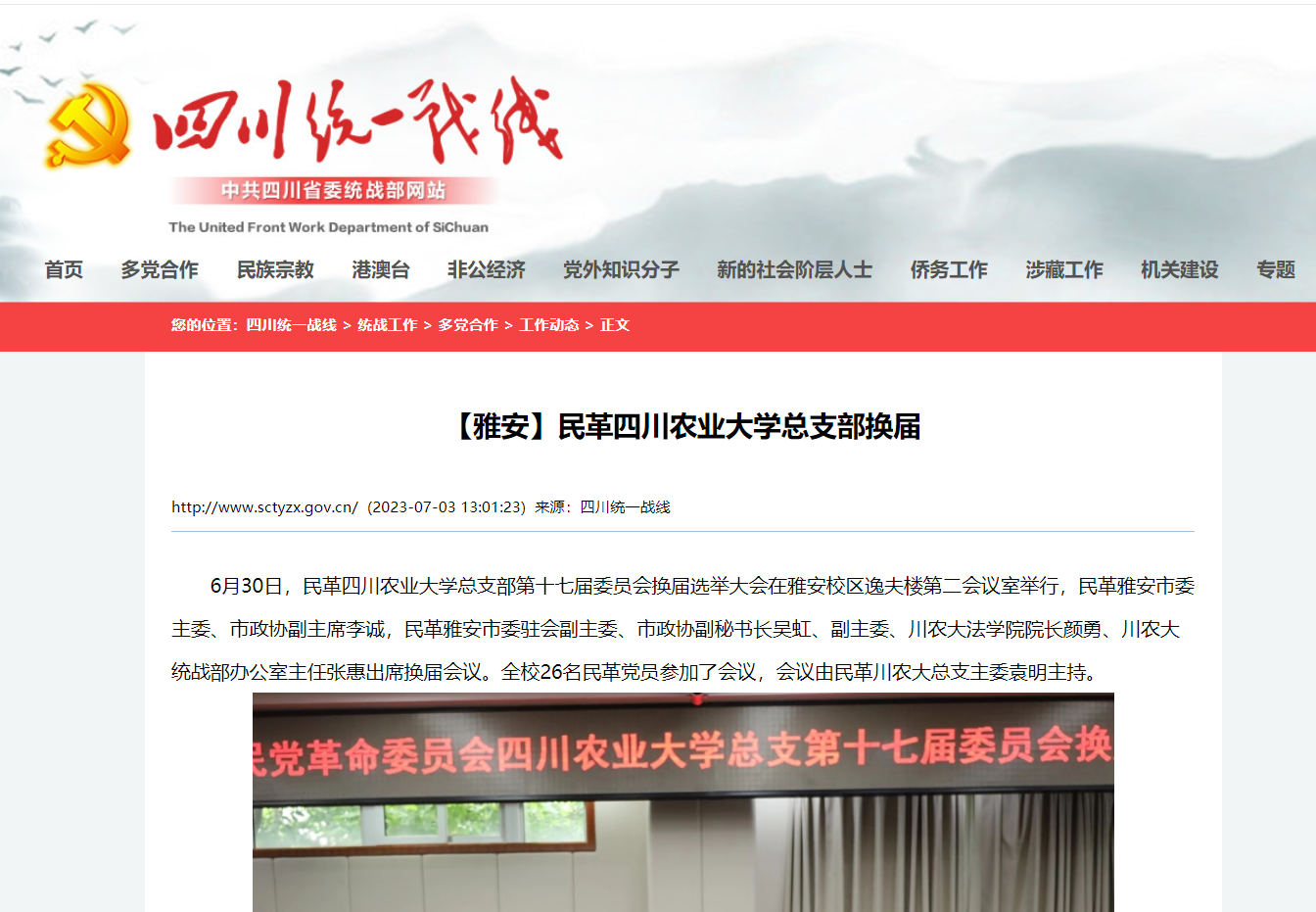 6月30日,民革太阳集团tyc86总支部第十七届委员会换届选举大会在雅安校区逸夫楼第二会议室举行,民革雅安市委主委、市政协副主席李诚,民革雅安市委驻会副主委、市政协副秘书长吴虹、副主委、川农大法学院院长颜勇、川农大统战部办公室主任张惠出席换届会议。全校26名民革党员参加了会议,会议由民革川农大总支主委袁明主持。
