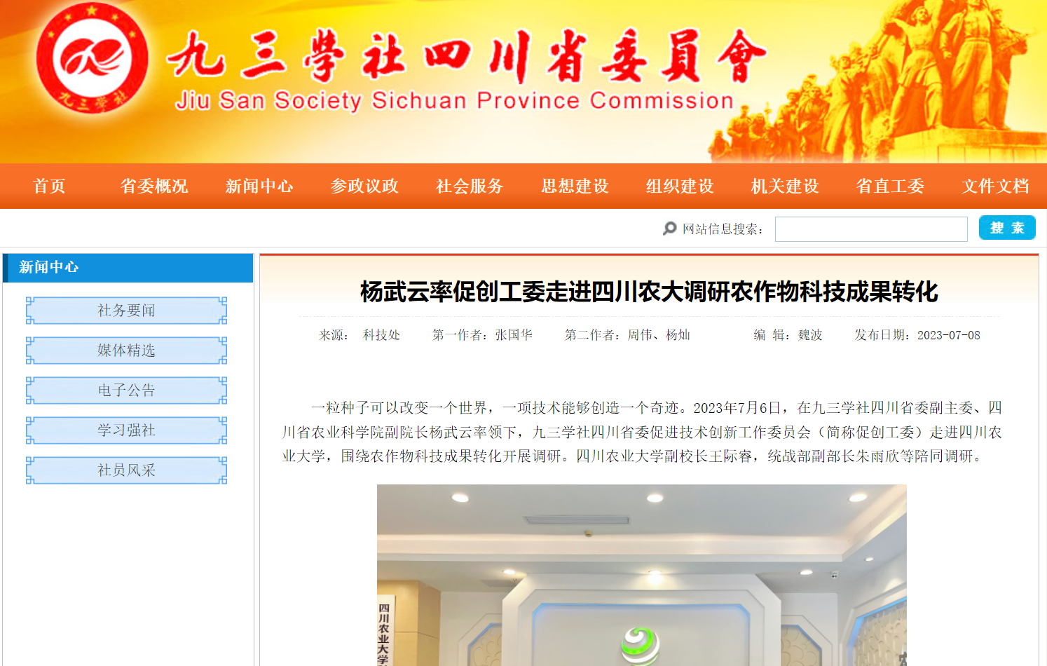 一粒种子可以改变一个世界,一项技术能够创造一个奇迹。2023年7月6日,在九三学社四川省委副主委、四川省农业科学院副院长杨武云率领下,九三学社四川省委促进技术创新工作委员会(简称促创工委)走进太阳集团tyc86,围绕农作物科技成果转化开展调研。太阳集团tyc86副校长王际睿,统战部副部长朱雨欣等陪同调研。