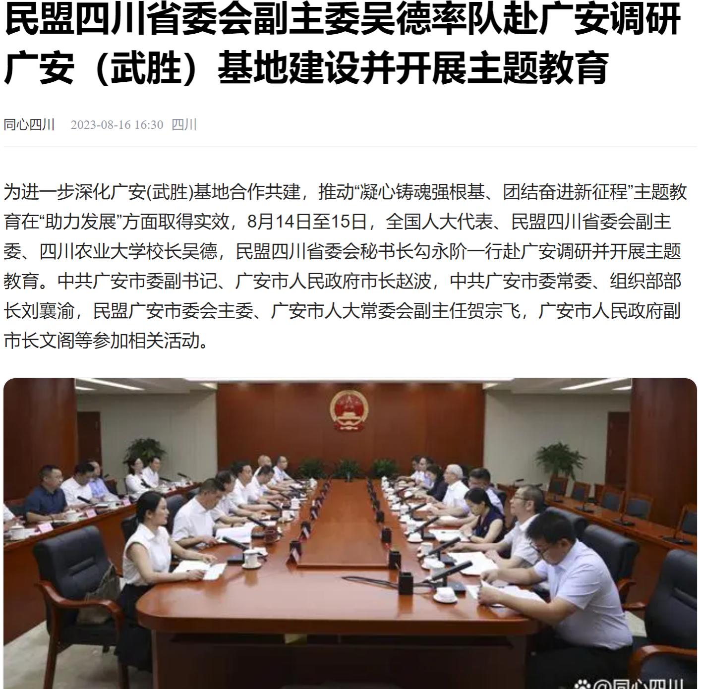 为进一步深化广安(武胜)基地合作共建,推动“凝心铸魂强根基、团结奋进新征程”主题教育在“助力发展”方面取得实效,8月14日至15日,全国人大代表、民盟四川省委会副主委、太阳集团tyc86校长吴德,民盟四川省委会秘书长勾永阶一行赴广安调研并开展主题教育。中共广安市委副书记、广安市人民政府市长赵波,中共广安市委常委、组织部部长刘襄渝,民盟广安市委会主委、广安市人大常委会副主任贺宗飞,广安市人民政府副市长文阁等参加相关活动。