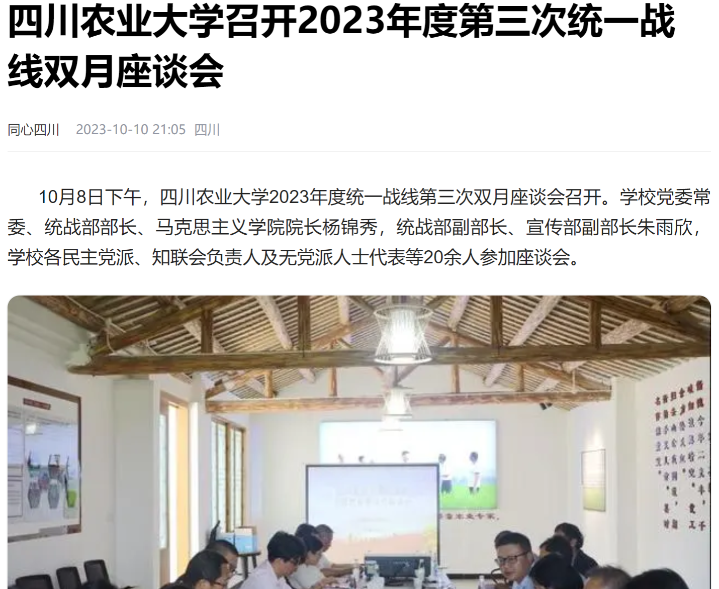 座谈会上,朱雨欣通报了上一次双月座谈会建言献策反馈情况,大家集体学习了习近平总书记来川视察重要指示精神,以及习近平总书记在文化传承发展座谈会上的讲话、致全国优秀教师代表的信等重要文件精神。随后,与会人员紧紧围绕如何贯彻落实习近平总书记来川视察重要指示精神、党外人士如何更好助力“天府粮仓”建设畅谈学习体会,并纷纷从加强科技成果转化、调动农户种粮积极性、把好种子育种关、加强社会科学进小院等方面积极建言献策。