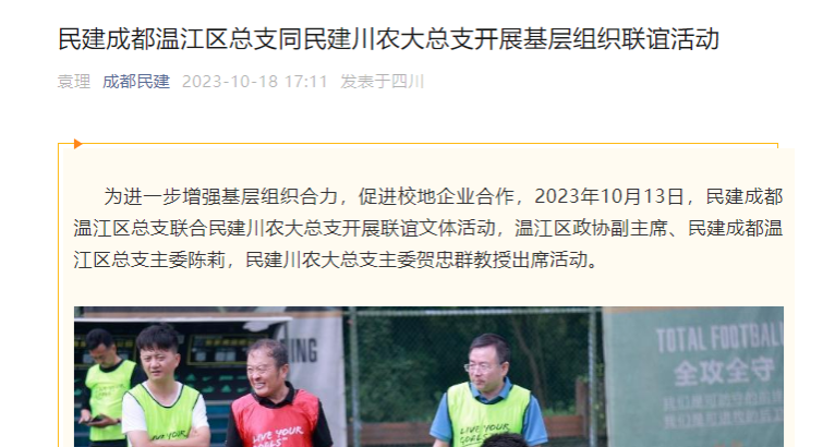 为进一步增强基层组织合力,促进校地企业合作,2023年10月13日,民建成都温江区总支联合民建川农大总支开展联谊文体活动,温江区政协副主席、民建成都温江区总支主委陈莉,民建川农大总支主委贺忠群教授出席活动。