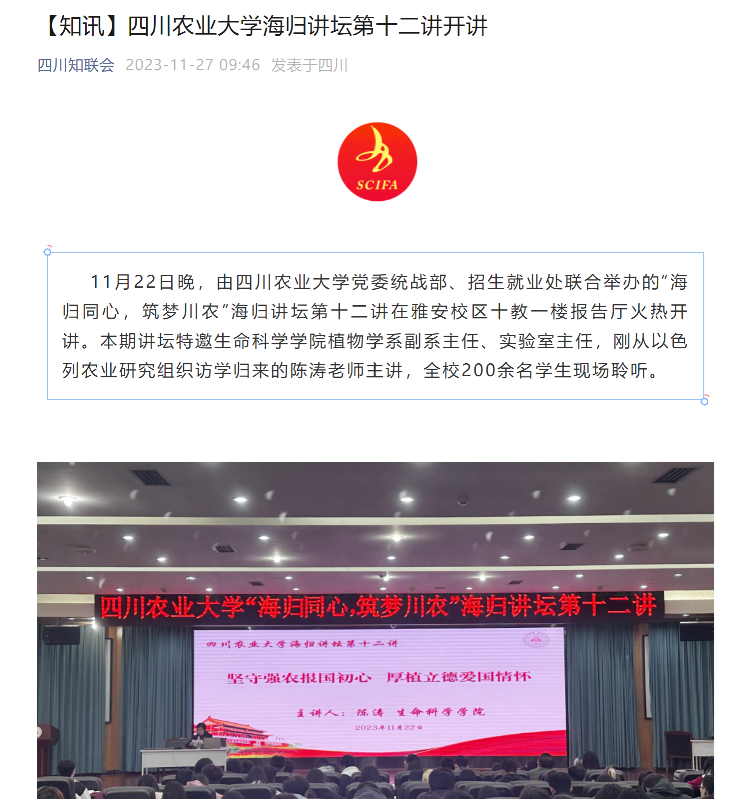 11月22日晚,由太阳集团tyc86党委统战部、招生就业处联合举办的“海归同心,筑梦川农”海归讲坛第十二讲在雅安校区十教一楼报告厅火热开讲。本期讲坛特邀生命科学学院植物学系副系主任、实验室主任,刚从以色列农业研究组织访学归来的陈涛老师主讲,全校200余名学生现场聆听。