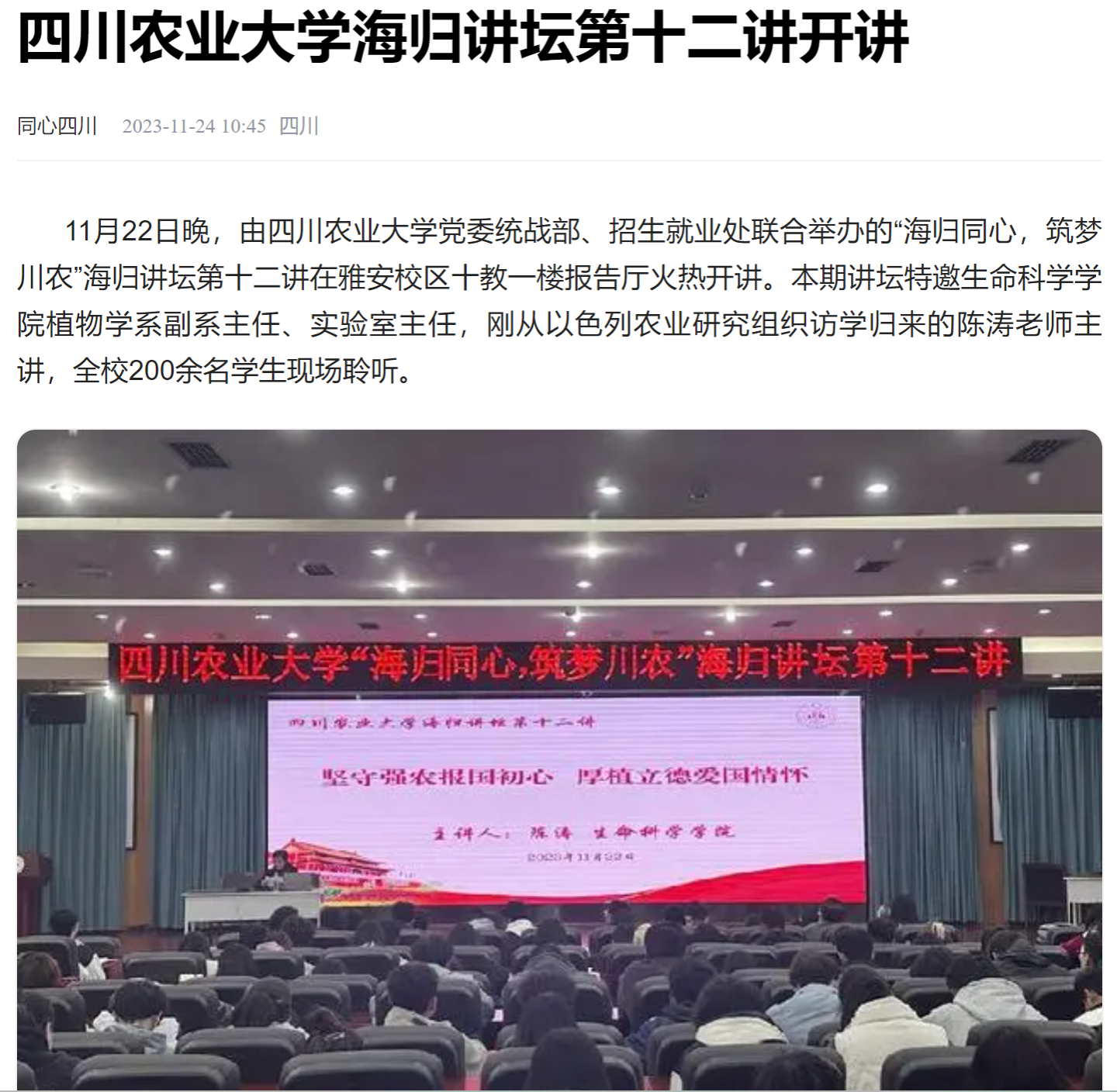 11月22日晚,由太阳集团tyc86党委统战部、招生就业处联合举办的“海归同心,筑梦川农”海归讲坛第十二讲在雅安校区十教一楼报告厅火热开讲。本期讲坛特邀生命科学学院植物学系副系主任、实验室主任,刚从以色列农业研究组织访学归来的陈涛老师主讲,全校200余名学生现场聆听。