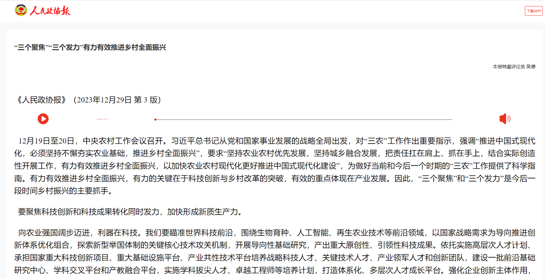 12月19日至20日,中央农村工作会议召开。习近平总书记从党和国家事业发展的战略全局出发,对“三农”工作作出重要指示,强调“推进中国式现代化,必须坚持不懈夯实农业基础,推进乡村全面振兴”,要求“坚持农业农村优先发展,坚持城乡融合发展,把责任扛在肩上、抓在手上,结合实际创造性开展工作,有力有效推进乡村全面振兴,以加快农业农村现代化更好推进中国式现代化建设”,为做好当前和今后一个时期的“三农”工作提供了科学指南。有力有效推进乡村全面振兴,有力的关键在于科技创新与乡村改革的突破,有效的重点体现在产业发展。因此,“三个聚焦”和“三个发力”是今后一段时间乡村振兴的主要抓手。