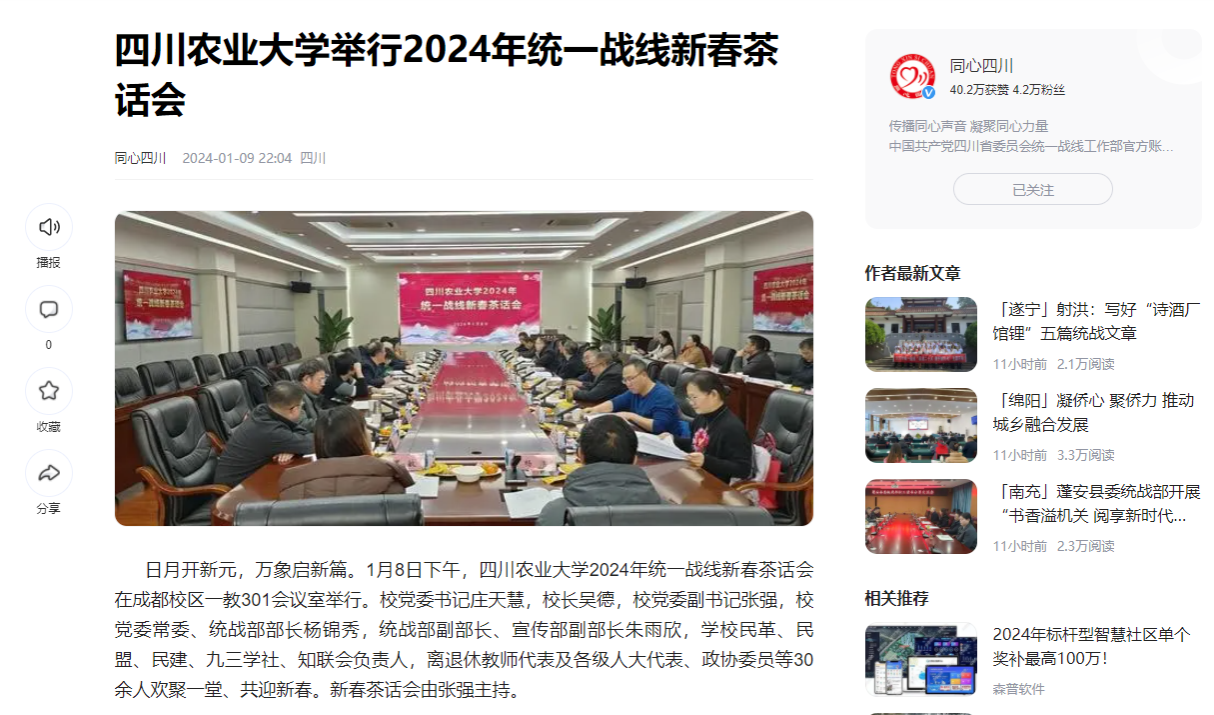 庄天慧强调,2024年是人民政协成立75周年,也是四川省政协成立70周年。对学校而言,这一年要朝着建设一流农业大学目标迈出铿锵步伐,任务艰巨、责任重大,为此,她提出了四点期望和建议。一是要牢记政治责任、强化思想政治引领。自觉在思想上政治上行动上与党中央保持高度一致,真正做到“思想上同心、政治上同向、行动上同行”。二是要立足工作岗位,全力以赴贡献力量。力争在教学科研、社会服务等本职工作中,做出更多看得见、摸得着、见得了成效的工作成绩。三是要强化社会服务,擦亮统战品牌特色。“同心三农”历来是学校统战工作的品牌特色,随着学校社会服务质量和社会影响力的持续提升,亟需全校统一战线在社会服务中做得新的更大贡献。四是加强咨政建言,推动成果有效转化。统一战线成员要立足自身学科优势,深入基层搞好调研,多建诤言、多献良策、多出实招,更好地发出川农大声音、贡献川农大智慧。