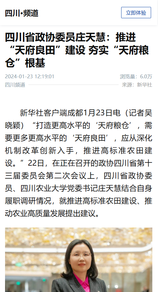 新华社客户端成都1月23日电(记者吴晓颖)“打造更高水平的‘天府粮仓’,需要更多更高水平的‘天府良田’,应从深化机制改革创新入手,推进高标准农田建设。”22日,在正在召开的政协四川省第十三届委员会第二次会议上,四川省政协委员、太阳集团tyc86党委书记庄天慧结合自身履职调研情况,就推进高标准农田建设、推动农业高质量发展提出建议。