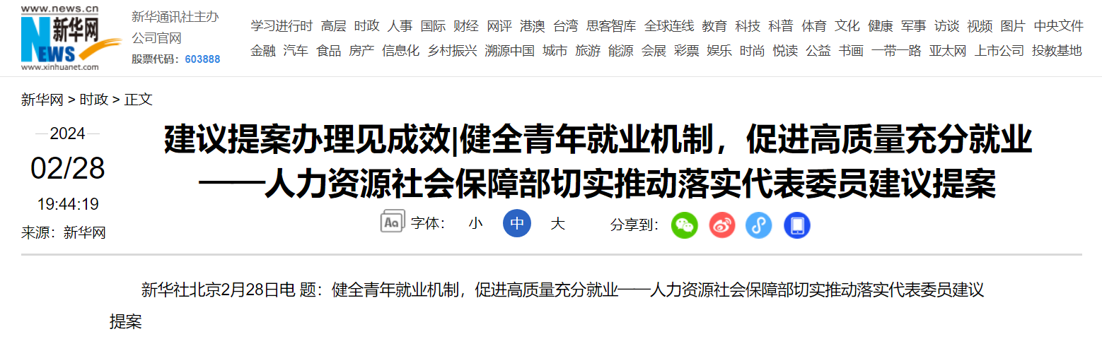 新华社北京2月28日电 题:健全青年就业机制,促进高质量充分就业——人力资源社会保障部切实推动落实代表委员建议提案