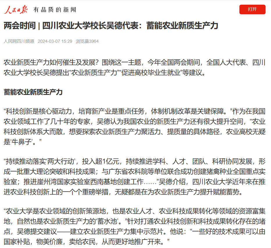 “农业大学是农业领域的创新策源地,也是农业人才、农业科技成果转化等领域的资源富集地,自然也是农业新质生产力的‘蓄水池’。”针对打通农业科技创新和科技成果转化存在的堵点,吴德提交建议——建立农业新质生产力集中示范片。他说:“一些好的技术成果可以由国家补贴,物美价廉,卖给农民,从而更好地推广开来。”
